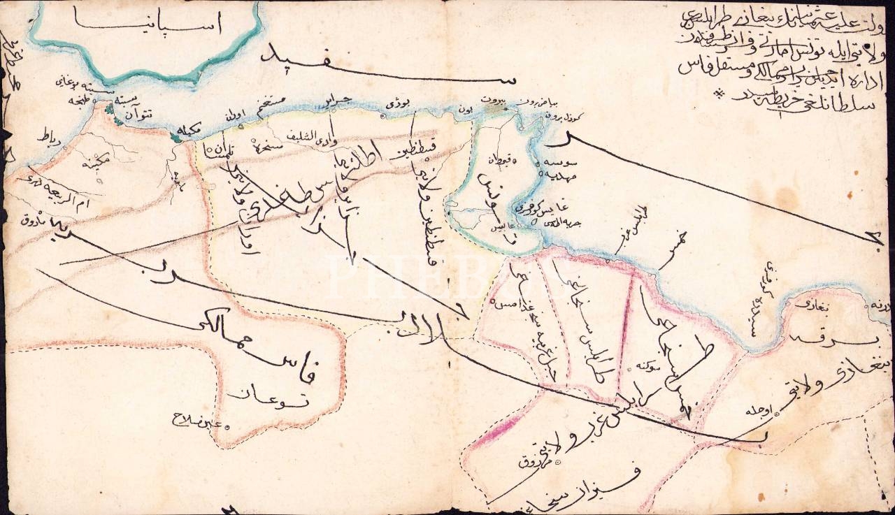 "Devlet-i Aliyye-i Osmaniye'nin Bingazi Trablusgarb Vilayeti ile Tunus Emareti ve Fransa tarafından idare edilen Cezayir Memaliki ve müstakil Fas Sultanlığı haritasıdır"