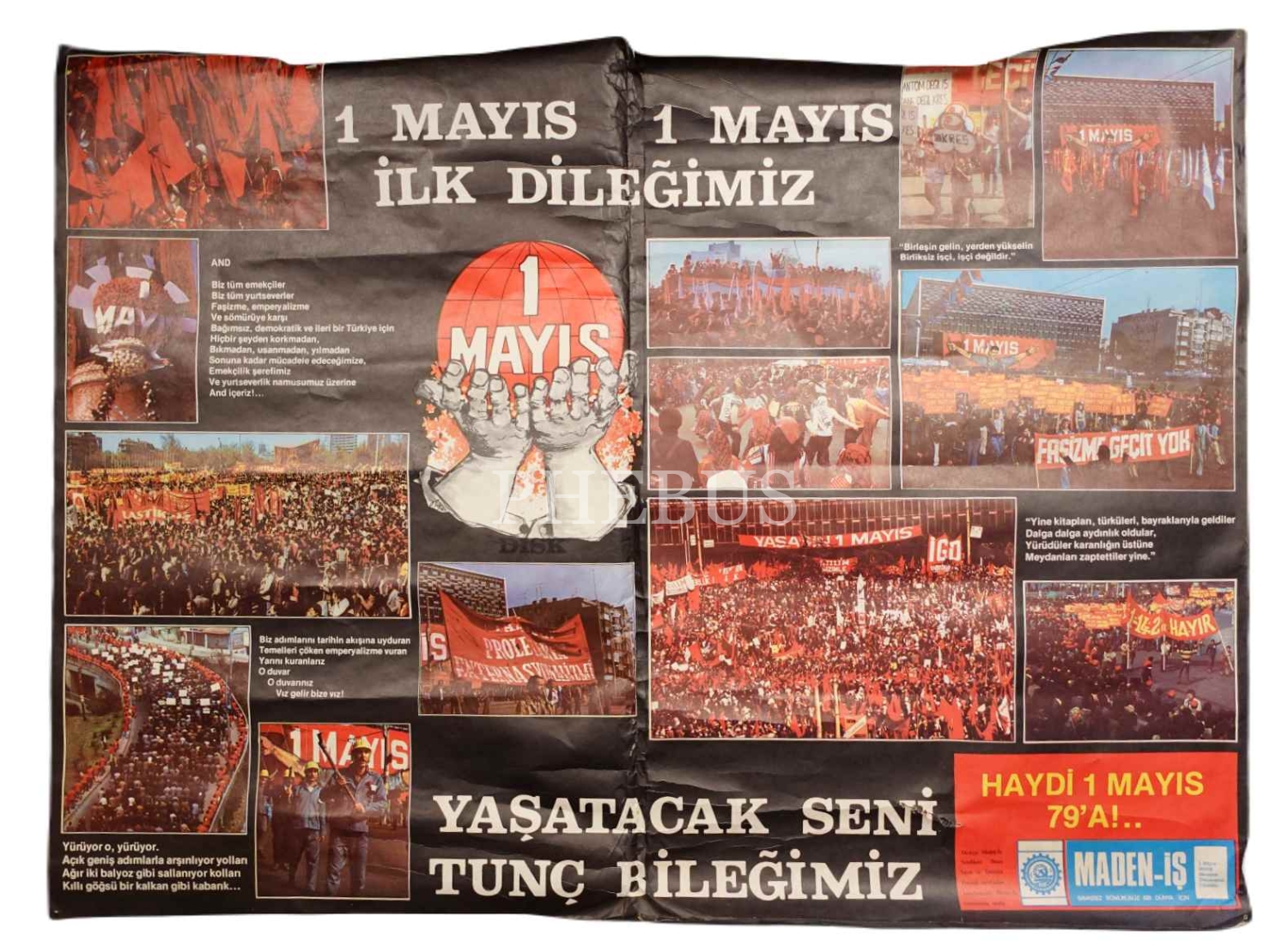 Türkiye Maden-İş Sendikası'ndan "1 Mayıs 1 Mayıs İlk Dileğimiz Yaşatacak Seni Tunç Bileğimiz" posteri, 81x109 cm, kenarları hafif yıpranmış haliyle