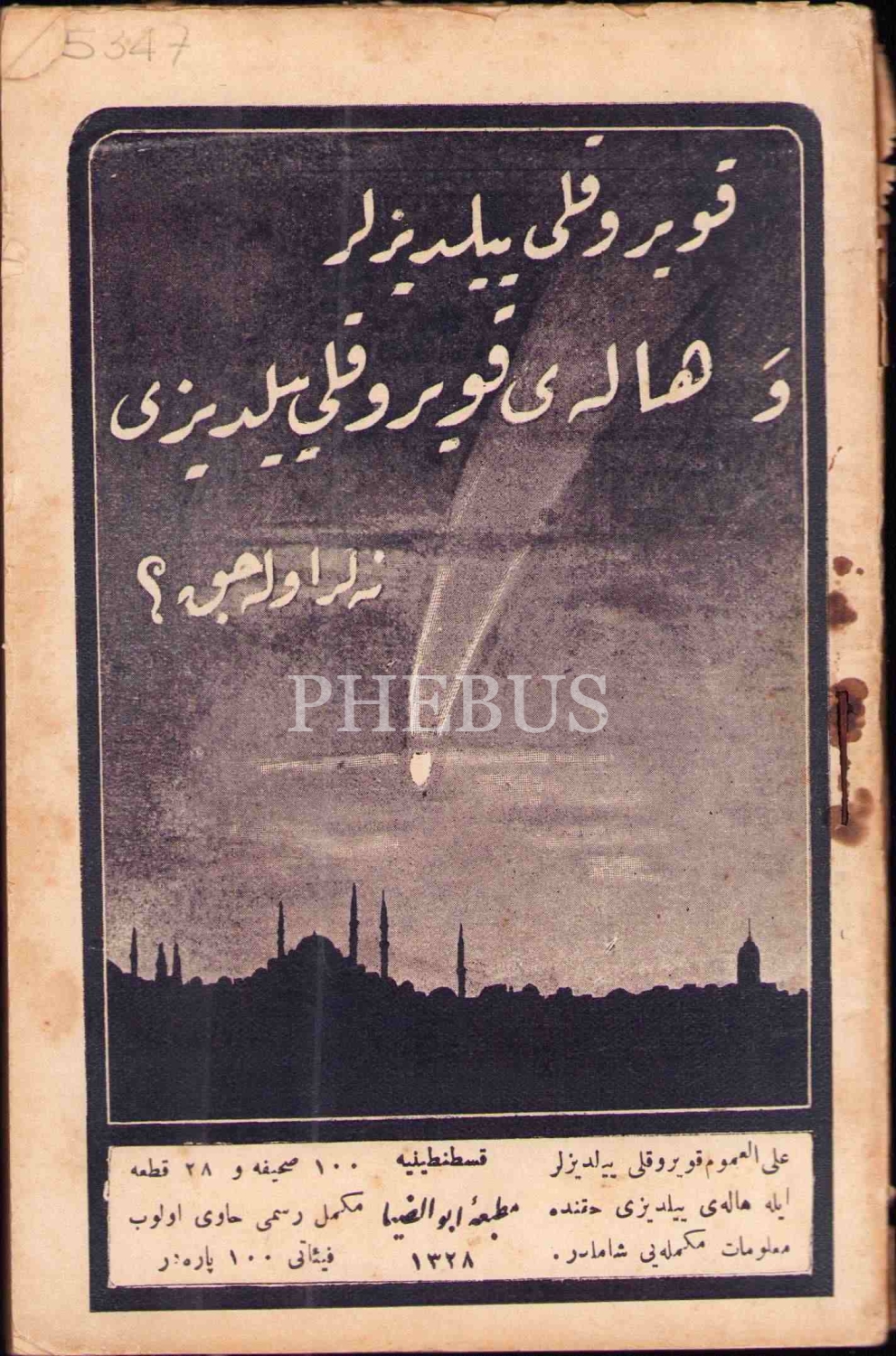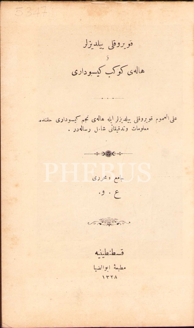 Osmanlıca Kuyruklu Yıldızlar ve Halley Kuyrukluyıldızı Neler Olacak?, A.V., Ebuzziya Matbaası, Kostantiniyye 1328, 96 s., 12x18 cm, sayfaları açılmamış ve kapak sayfası hafif yıpranmış haliyle
