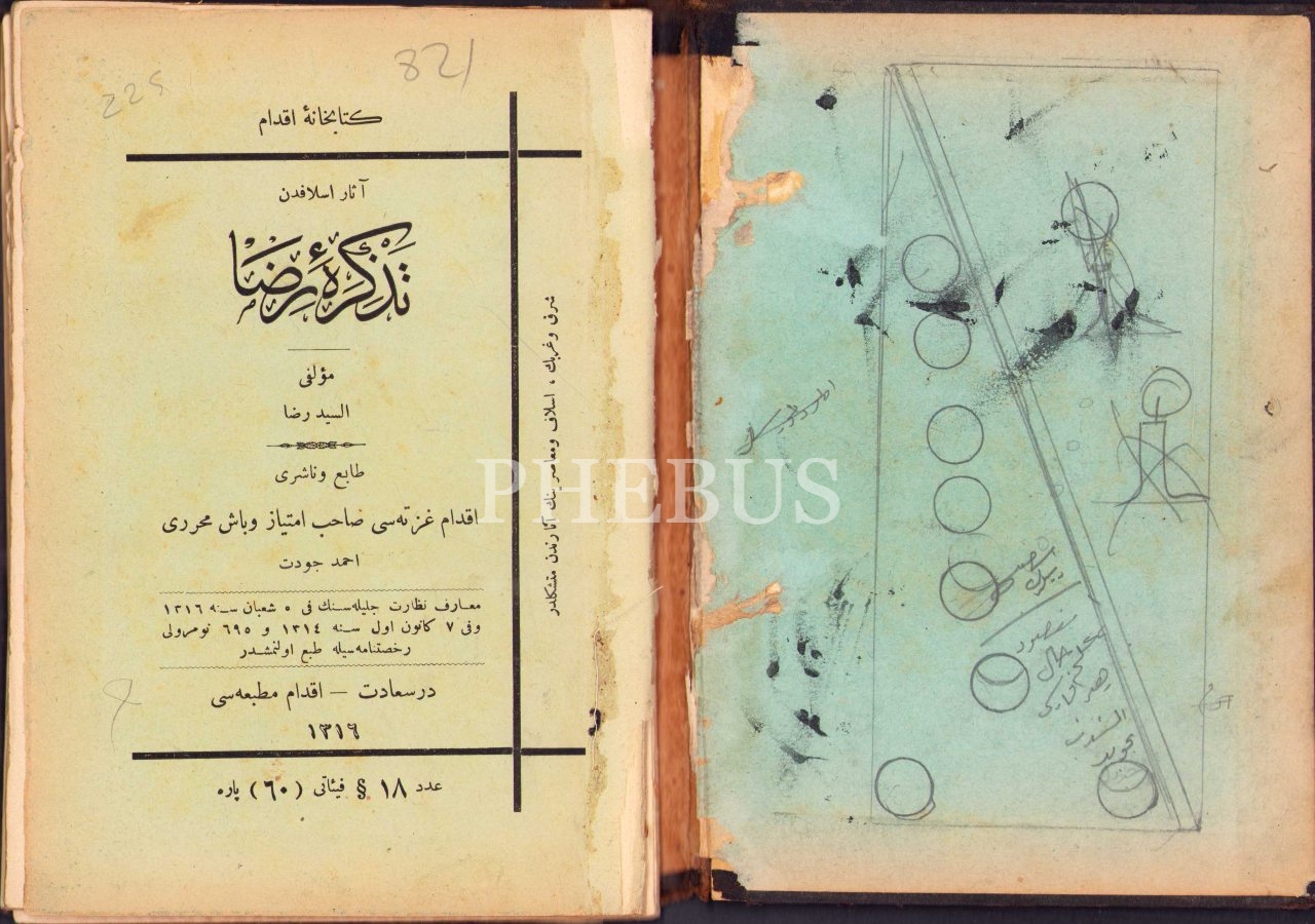 Tuğralı ve Osmanlı armalı cildinde Osmanlıca Tezkire-i Rızâ, Seyyid Rıza, İkdam Matbaası, Dersaadet [İstanbul] 1316, 109 s., 14x19 cm, sırtı ayrık ve cildi hafif yıpranmış haliyle