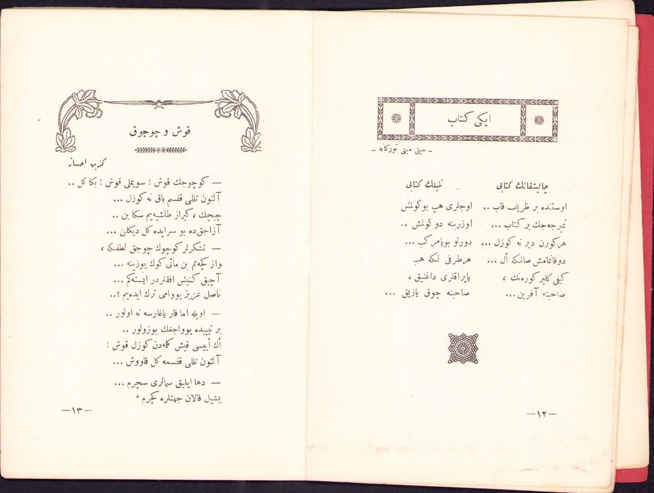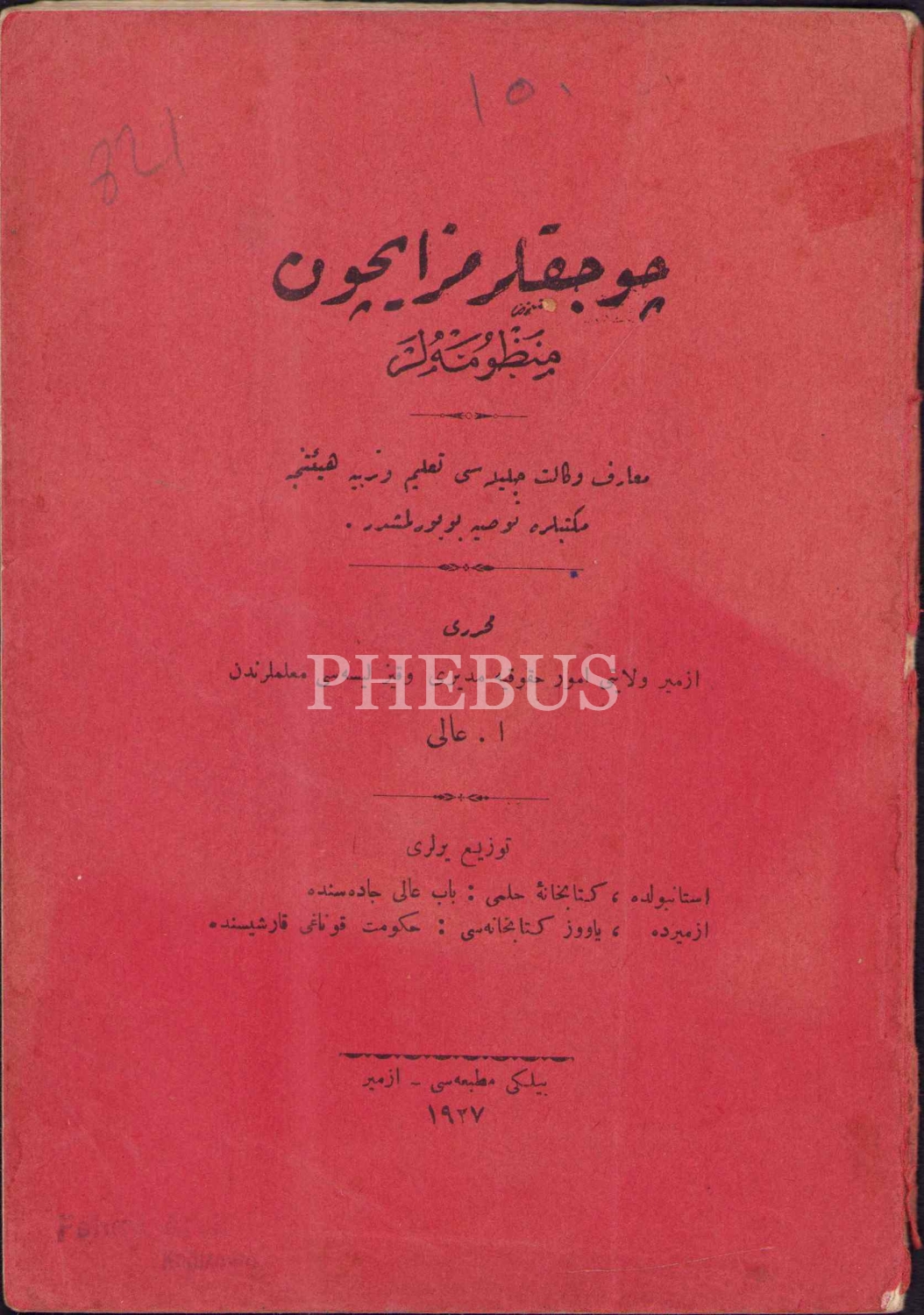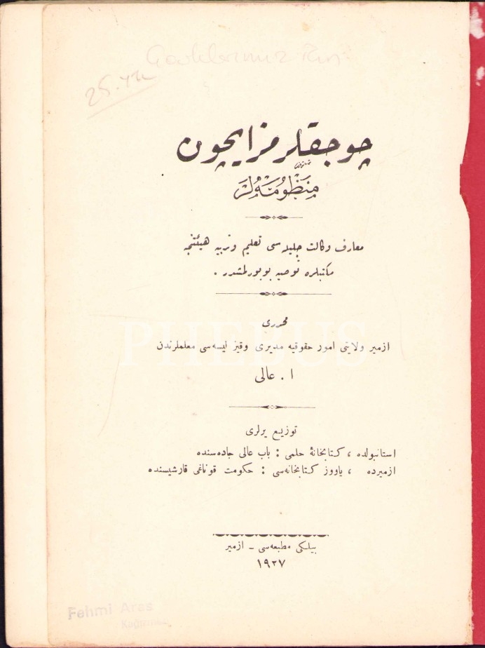 Osmanlıca Çocuklarımız İçin Manzûmeler, E. Âli, Bilgi Matbaası, İzmir 1927, 55 s., 14x20 cm, arka kapak sayfası mevcut değil