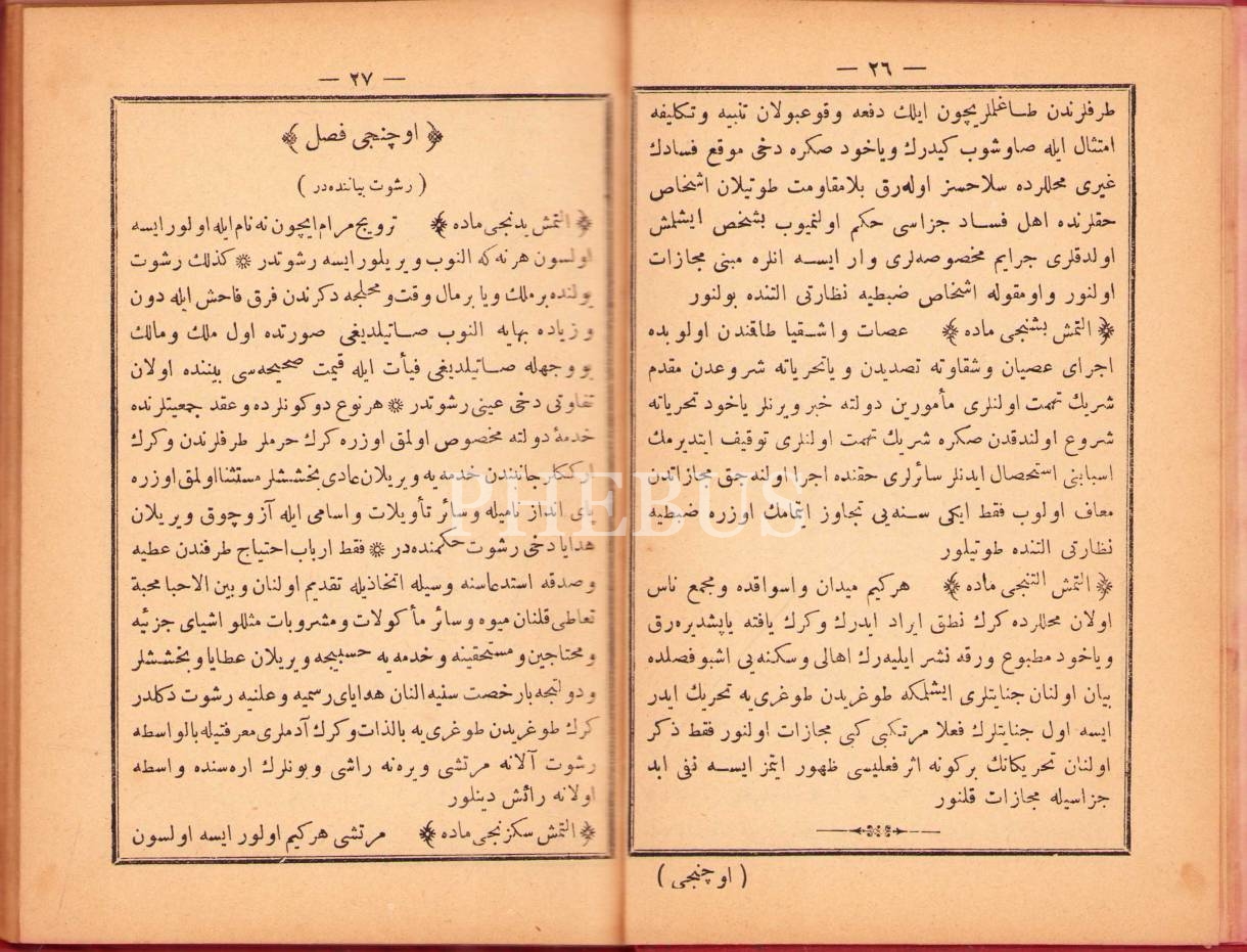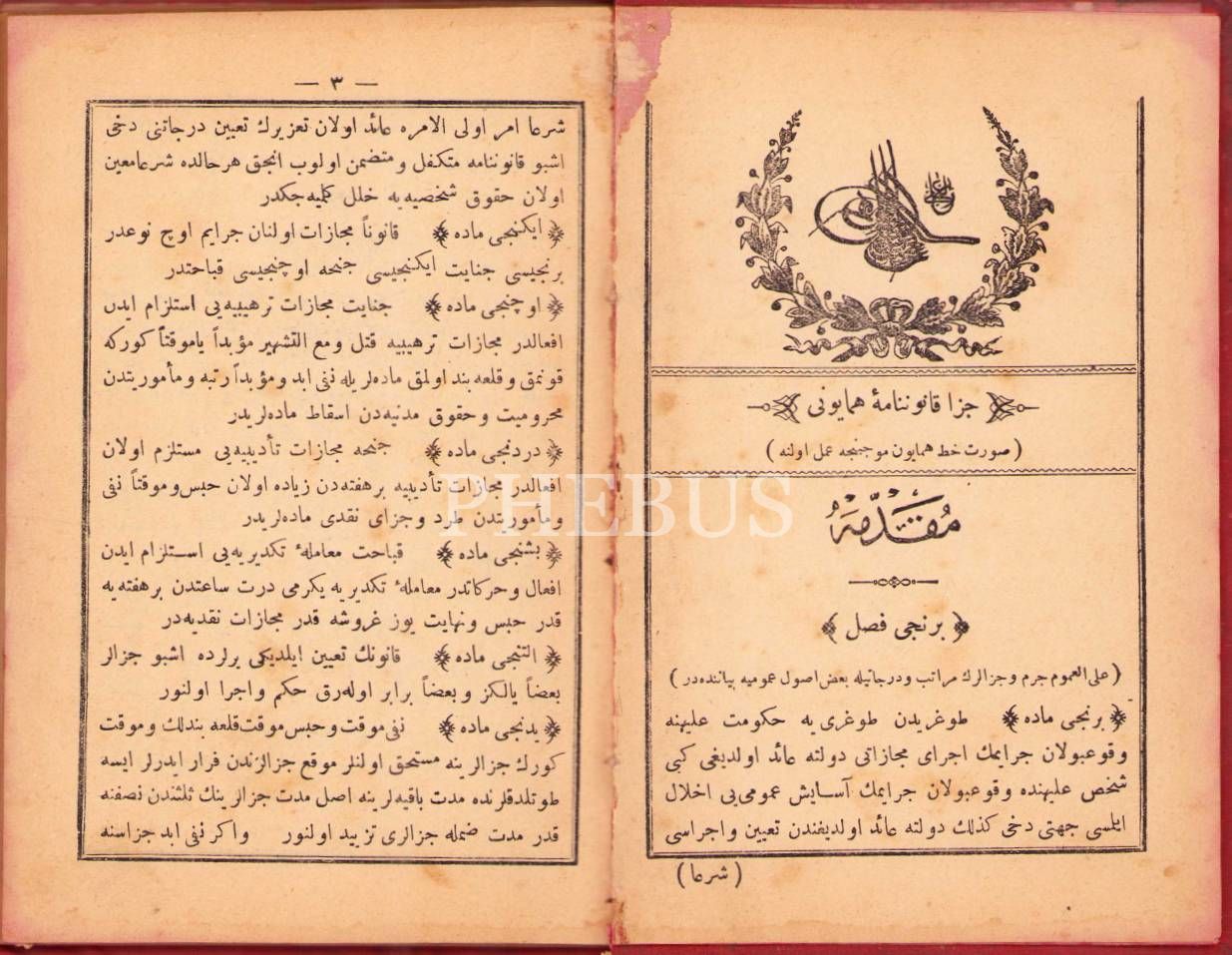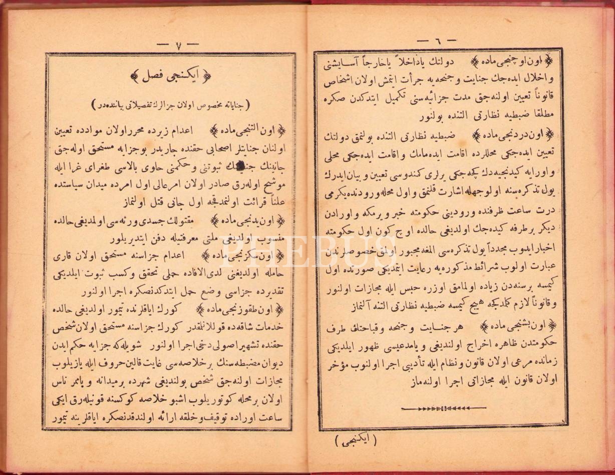 Osmanlıca Cezâ Kânûnnâme-i Hümâyûnu, Osmaniye Matbaası, 108 s., 12x18 cm, bazı sayfaları hafif yırtık haliyle