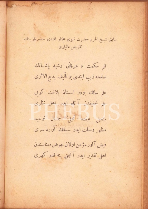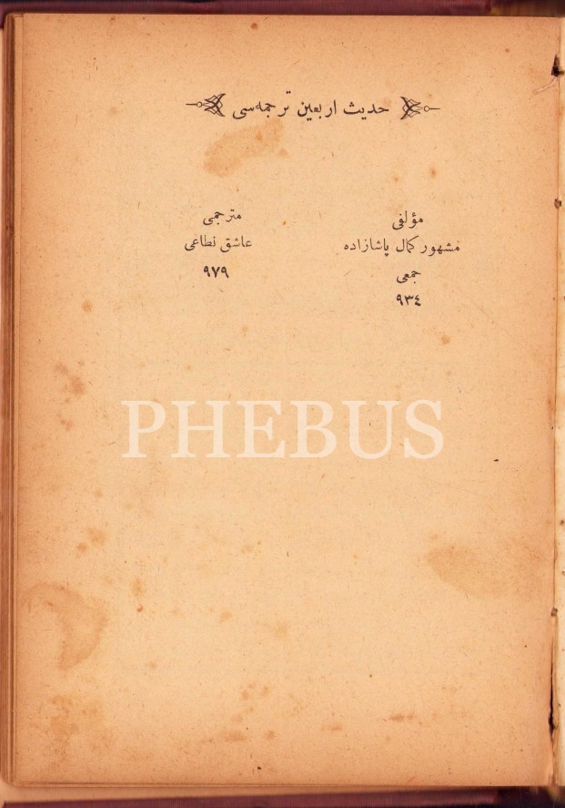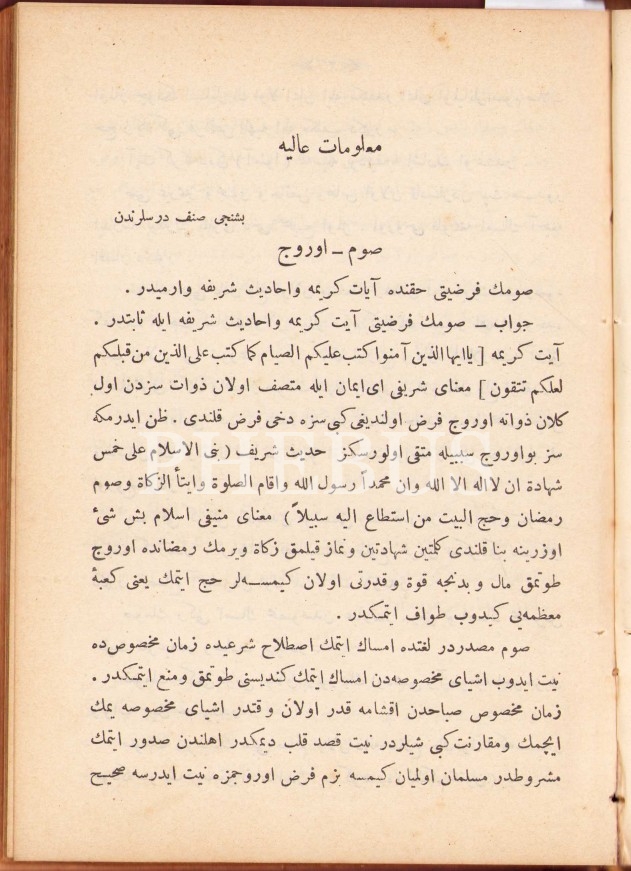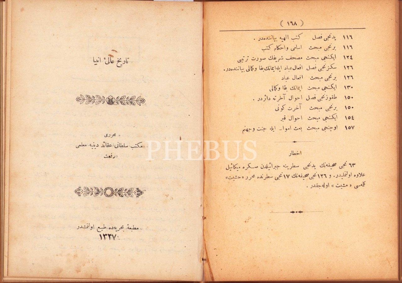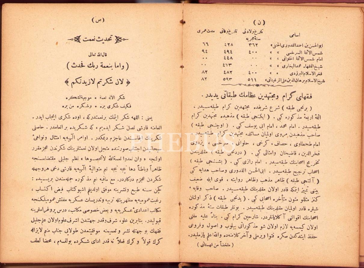 Dîn-i Mübîn-i İslâm, Hacı Reşid Paşa, Hayriye Matbaası, İstanbul 1328, 168 s.; Târîh-i Âli-i Enbiyâ, Rifat, Bahriye Matbaası, 1327, 45 s.; Ma'lûmât-ı Âliye [Dinî Bilgiler], 18 s.; Hadîs-i Erbaîn Tercümesi, Kemal Paşazade Cem'î, Aşık Nıtâî?, 56 s., sırtı ayrık ve cildi yorgun haliyle