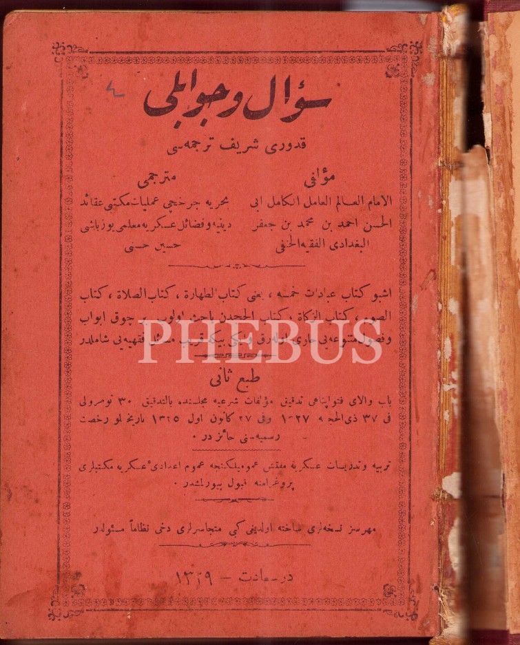 Osmanlıca 4 eser tek ciltte: Suâl ve Cevâblı Kudûrî-i Şerîf Tercümesi, Ebu'l-Hasen Ahmed el-Bağdadi el-Hanefi, çev. Hüseyin Hüsnü, Mekteb-i Harbiye-i Şahane Matbaası, Dersaadet [İstanbul] 1329, 288 s.;