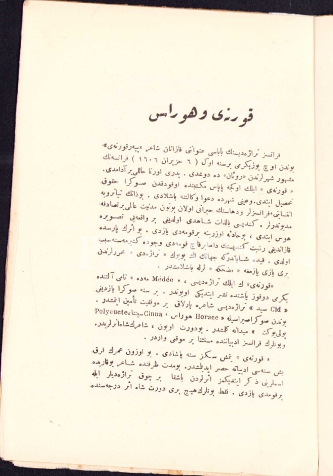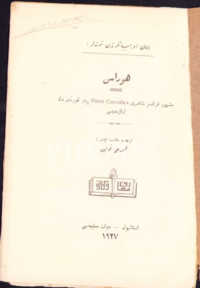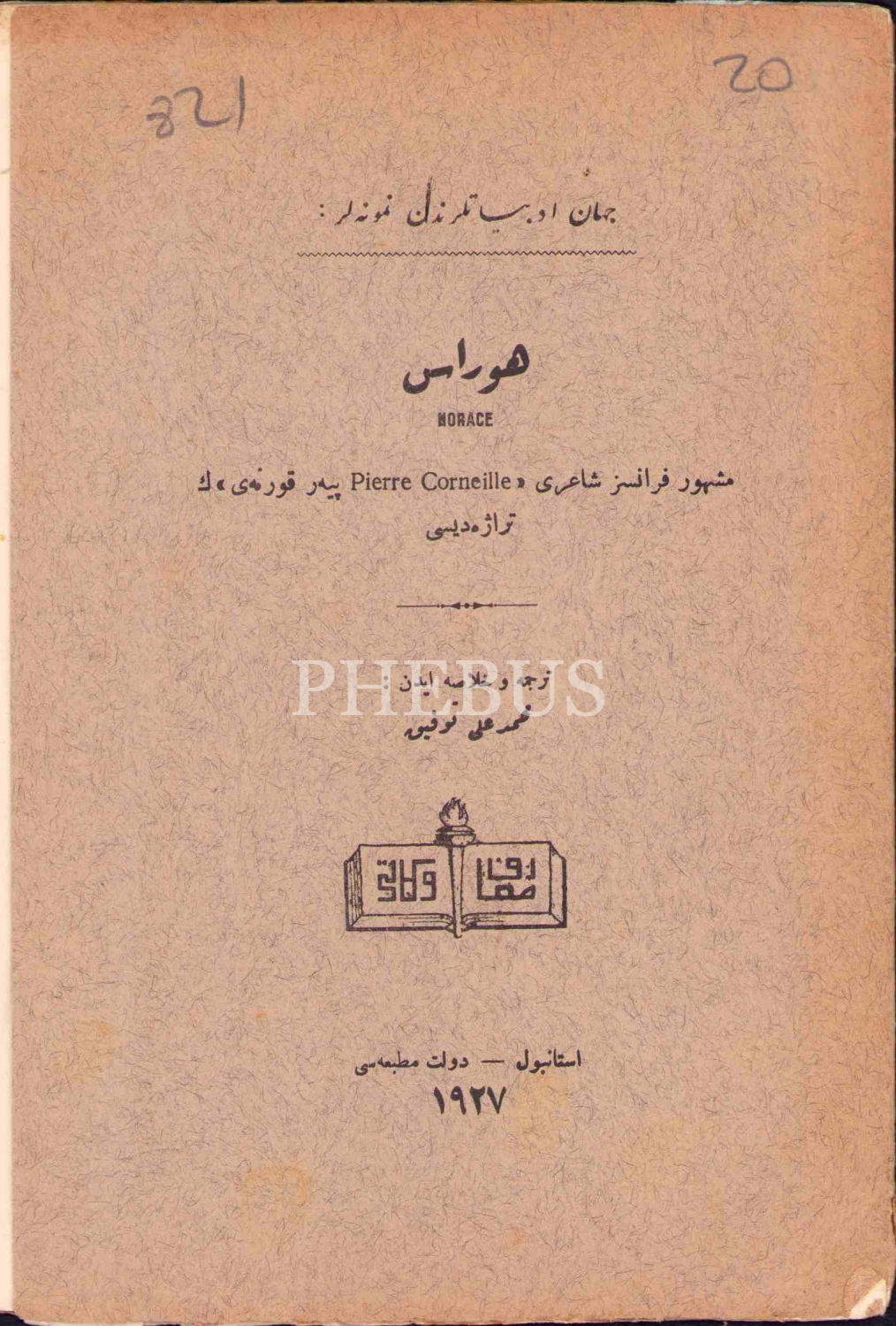Osmanlıca Horace [Trajedi], Pierre Corneille, çevirip özetleyen: Mehmed Ali Tevfik, Devlet Matbaası, İstanbul 1927, 26 s., 14x21 cm, kapağı hafif yıpranmış haliyle