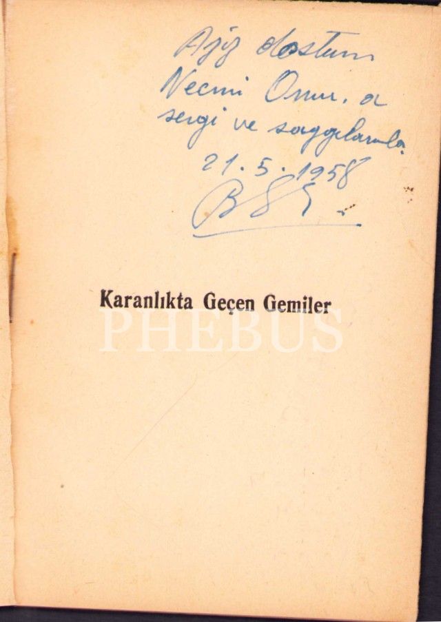 KARANLIKTA GEÇEN GEMİLER, Baki Süha Ediboğlu, 1958, Varlık Yayınları, 64 sayfa, 12 X 16,5 cm… Gazeteci – Yazar Necmi Onur’a imzalı…