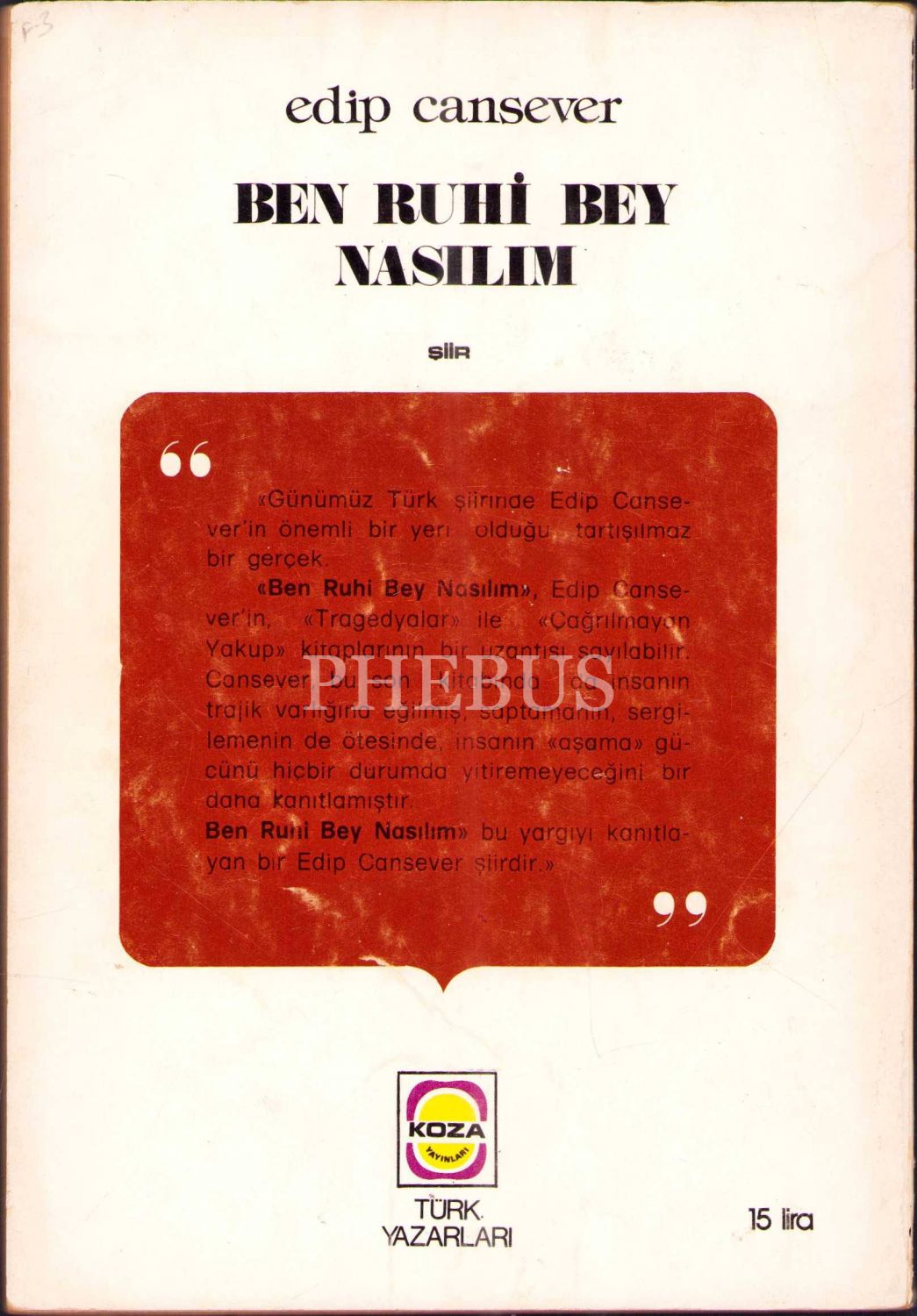 BEN RUHİ BEY NASILIM, Edip Cansever, 1976, Koza Yayınları, 105 sayfa, 13,5 X