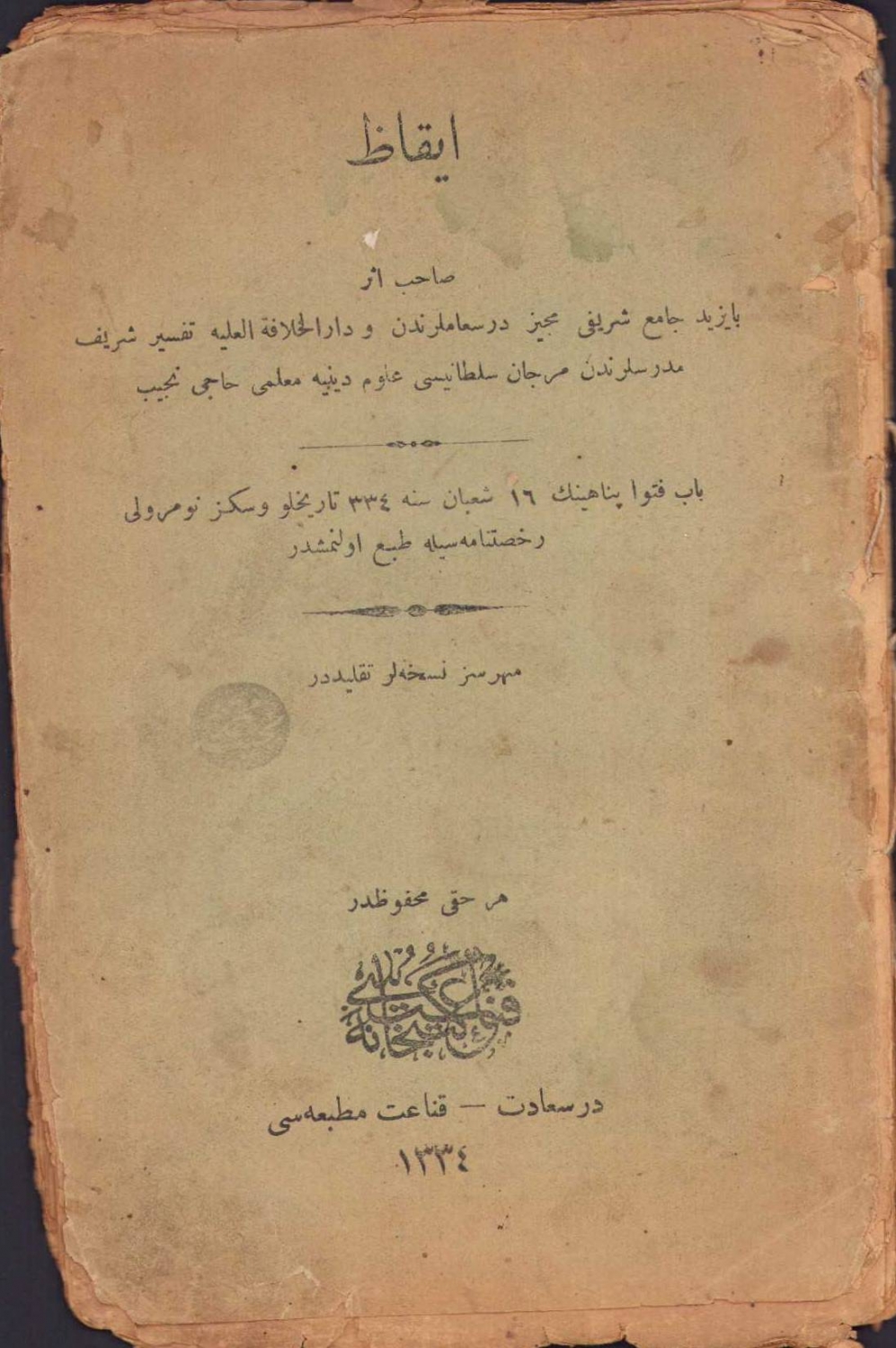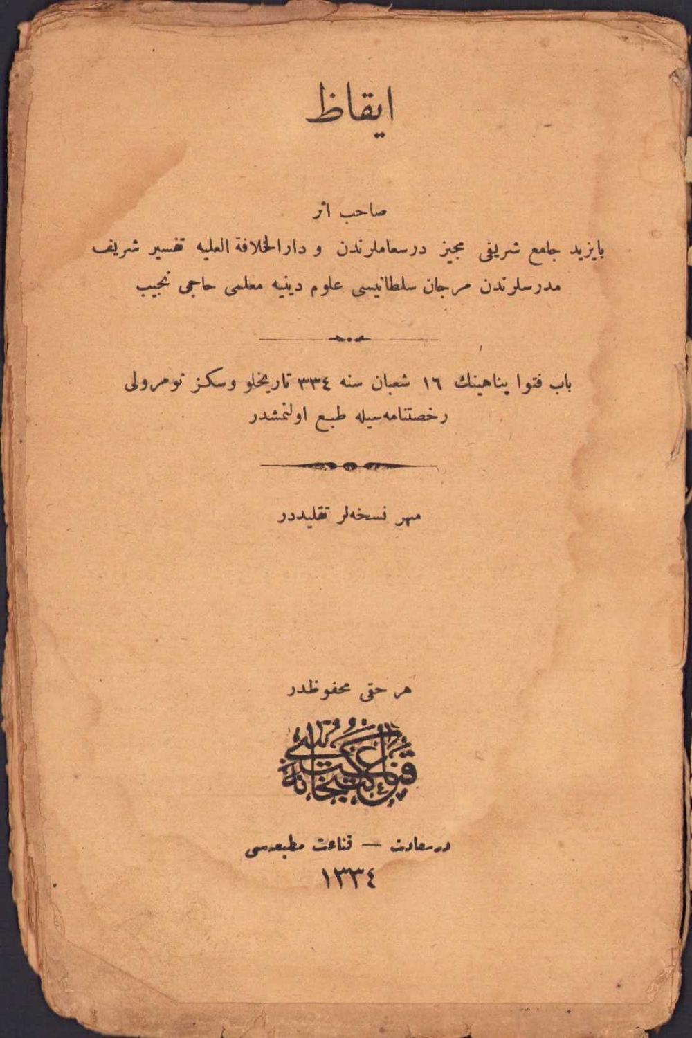 İkaz, Hacı Necip, Kanaat Matbaası, Dersaadet, 1334, Osmanlıca, mühürsüz nüshalar taklittir, cilt haliyle, 39 sayfa, 13x20cm