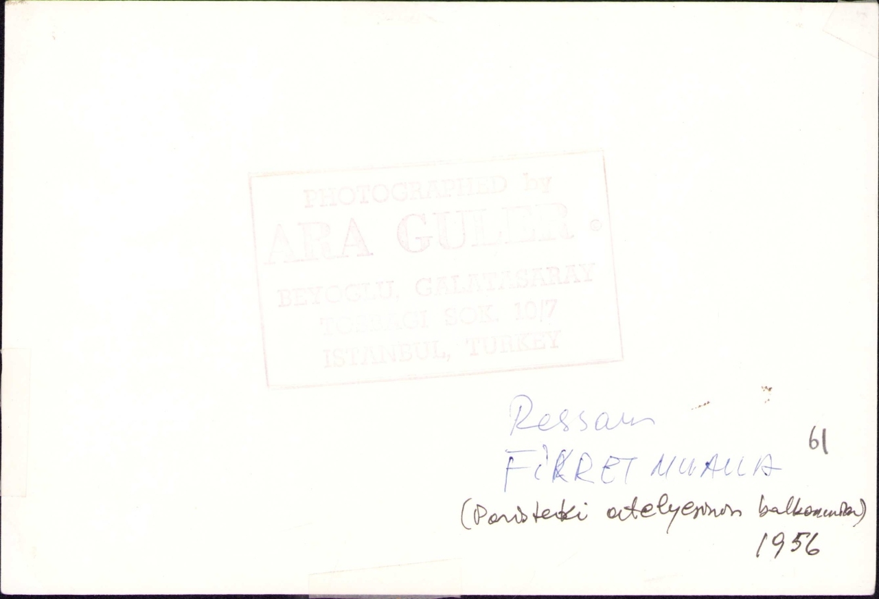 “Ressam Fikret Mualla (Paris’teki atölyesinin balkonunda) 1956” yazısı yazılmış.