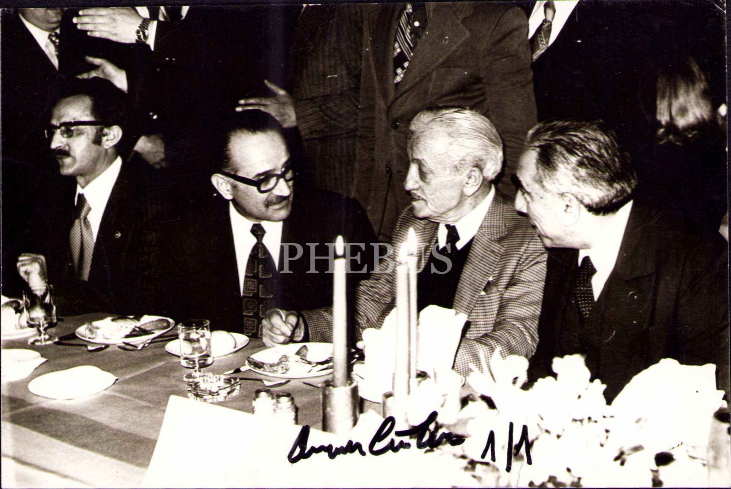 NECİP FAZIL KISAKÜREK’İN, MHP LİDERİ ALPARSLAN TÜRKEŞ VE KURMAYLARIYLA BİRLİKTE ÇEKİLMİŞ, ARA GÜLER ISLAK İMZALI VE KAŞELİ FOTOĞRAFI İLE ARA GÜLER'İN YILLAR SONRA ELİNDE BU FOTOĞRAFLA ÇEKİLMİŞ FOTOĞRAFI, 12 X 17,5 cm…