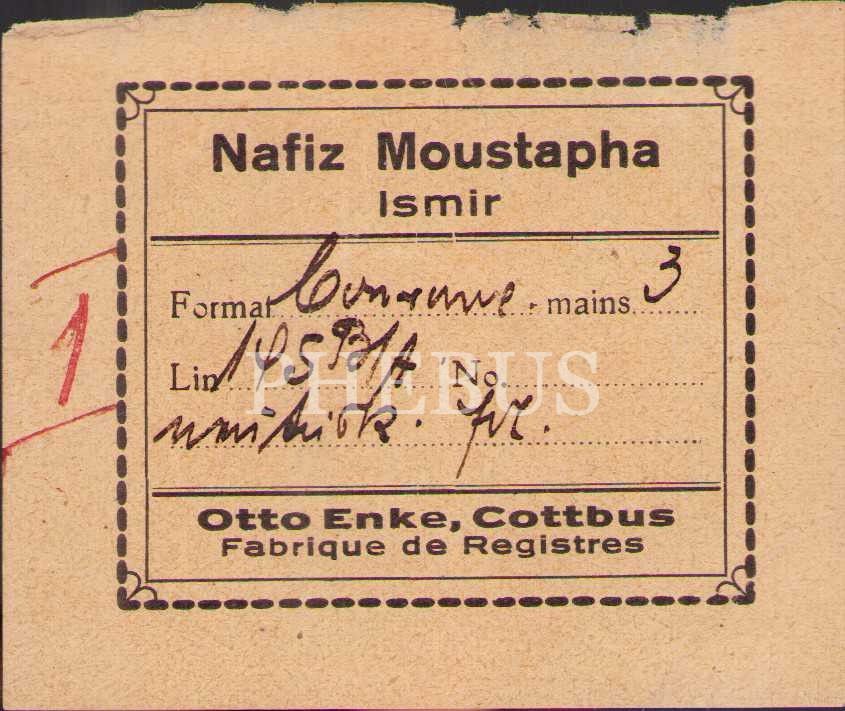 "Nafiz Moustapha-Ismir" antetli etiket, 6x7 cm, üst kenarı yırtık haliyle