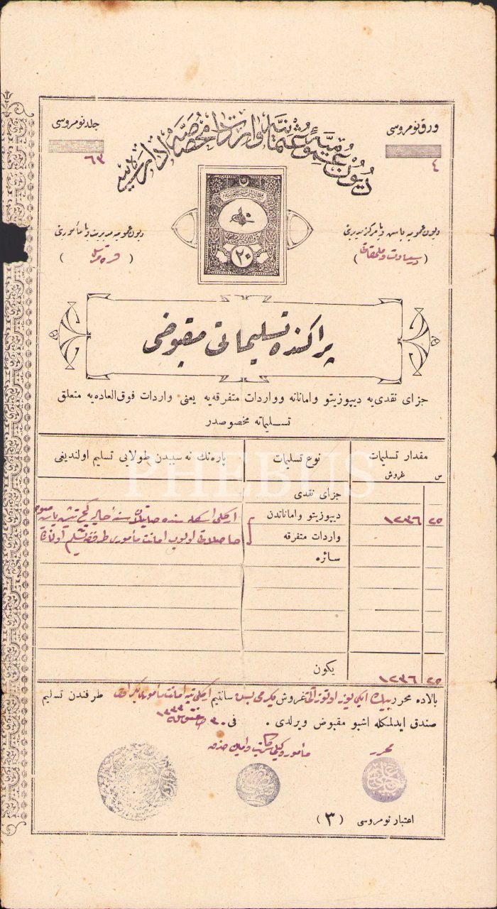 Osmanlıca Duyun-ı Umumiye-i Osmaniye ve Varidat-ı Muhassasa İdaresi antetli perakende teslimatı makbuzu, Dersaadet [İstanbul] 1333, 16x29 cm, bir kenarı kopuk haliyle