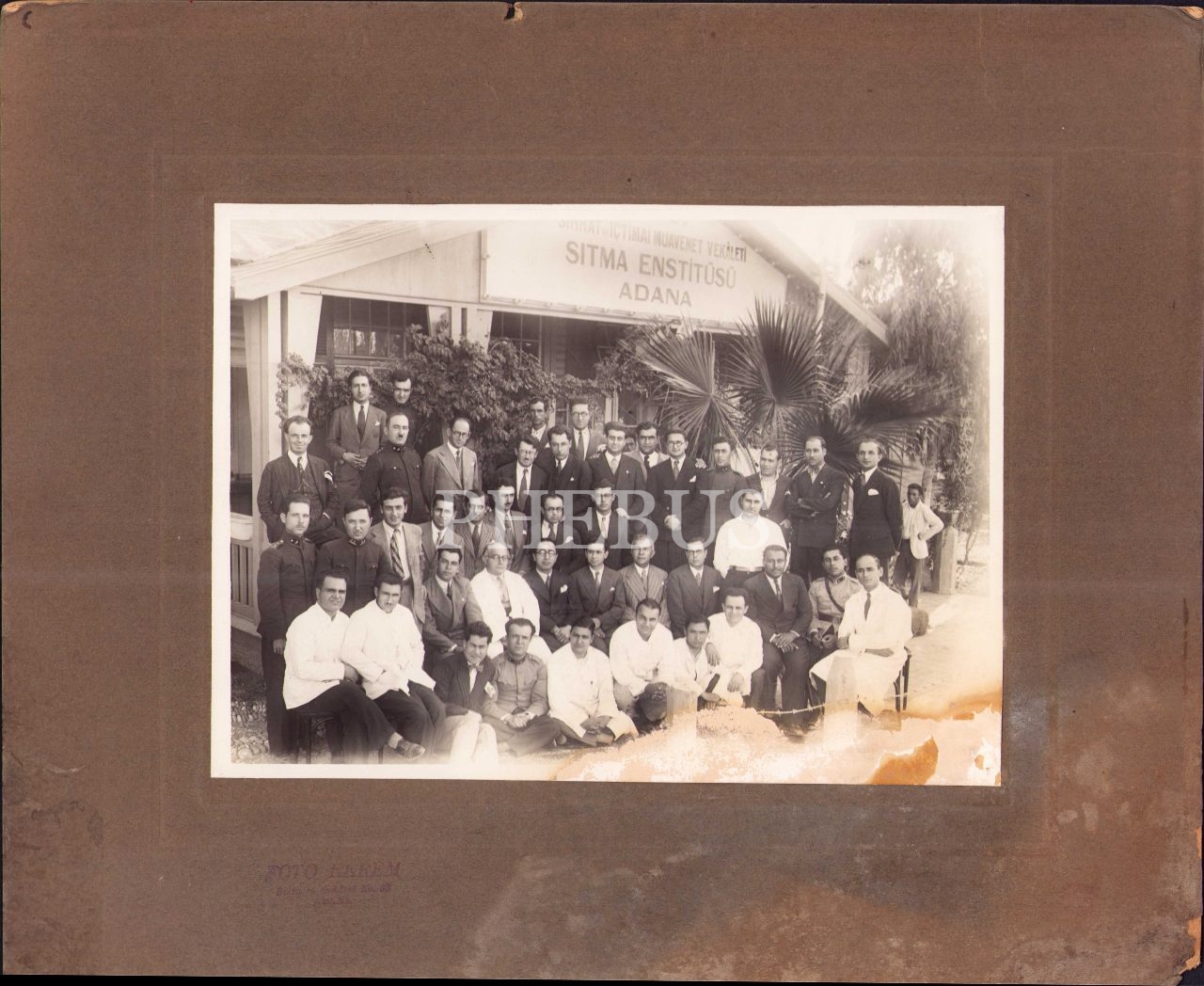 Adana Sıtma Enstitüsü tabelası önünde topluluk hatıra fotoğrafı, Foto Ekrem-Adana, 29x35 cm