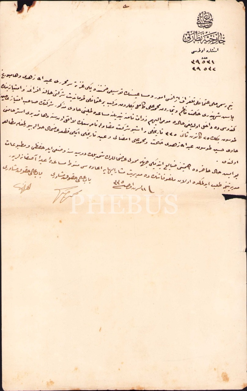 Hariciye Nezareti antetli ve 1335 tarihli Osmanlıca evrak, 20x32 cm, kenarları yıpranmış haliyle