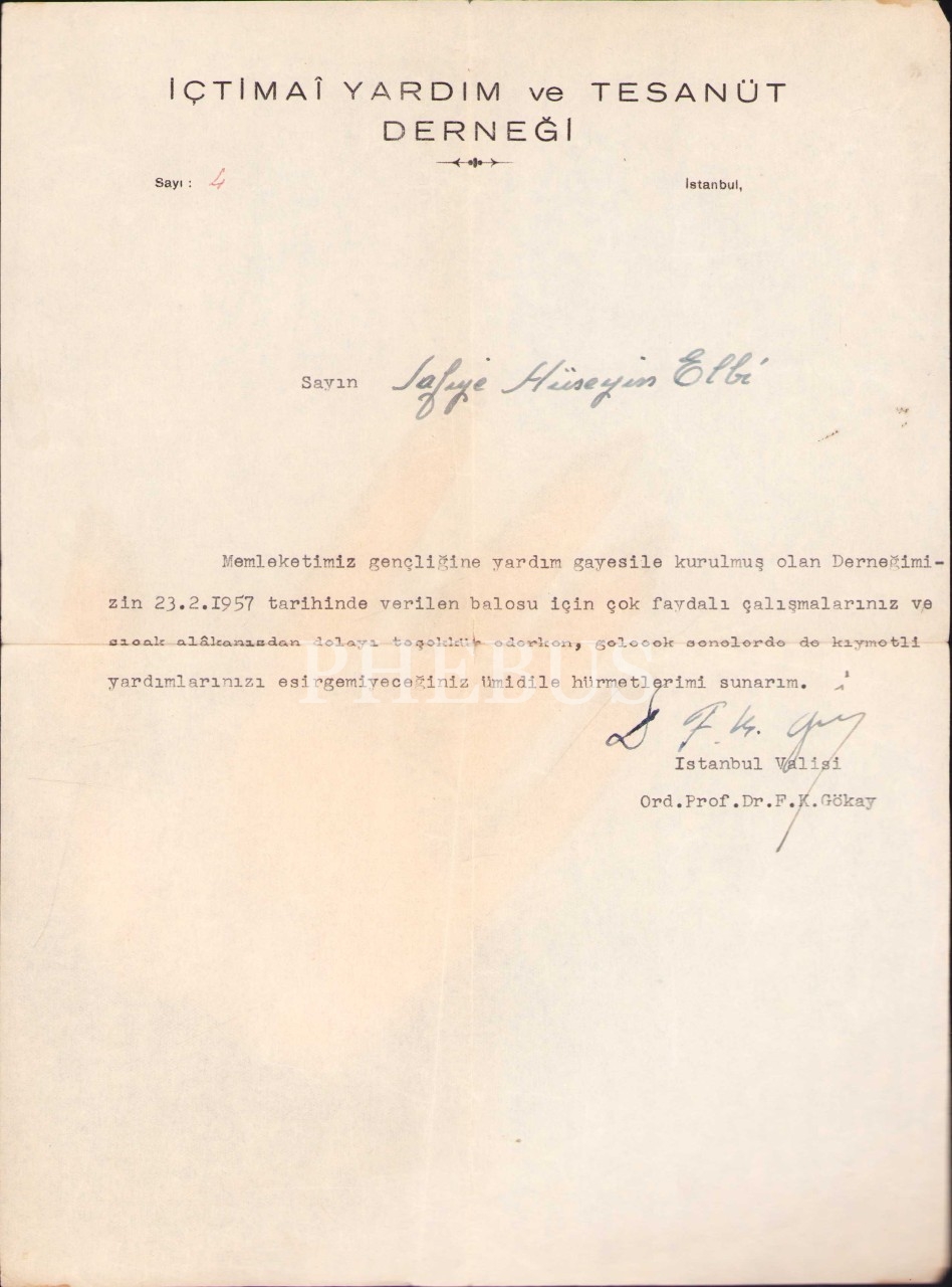 İstanbul Valisi Fahreddin Kerim Gökay'dan ilk Türk hemşirelerden Safiye Hüseyin Elbi'ye 1957 tarihli teşekkür mektubu, 21x29 cm