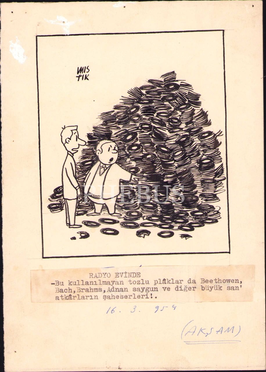 1954 yılına ait "Radyo Evinde" başlıklı ve Mıstık imzalı karikatür, 15x21 cm