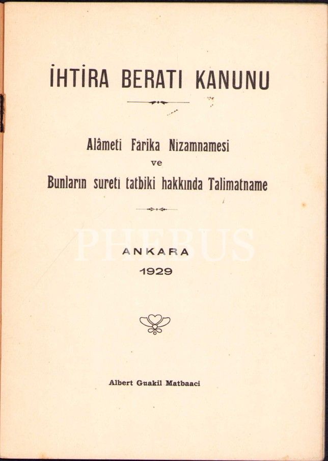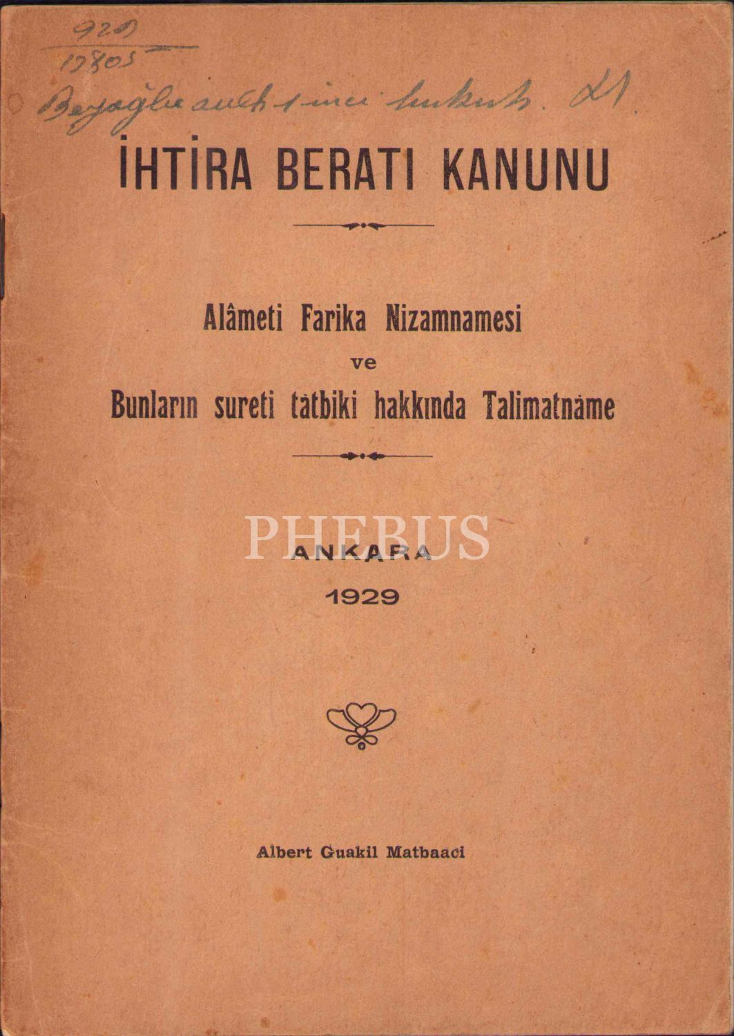 İhtira Beratı Kanunu, Albert Guakil Matbaacı, Ankara 1929, 36 s., 14x19 cm