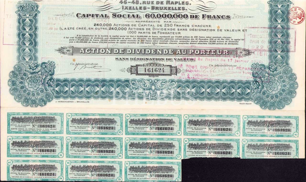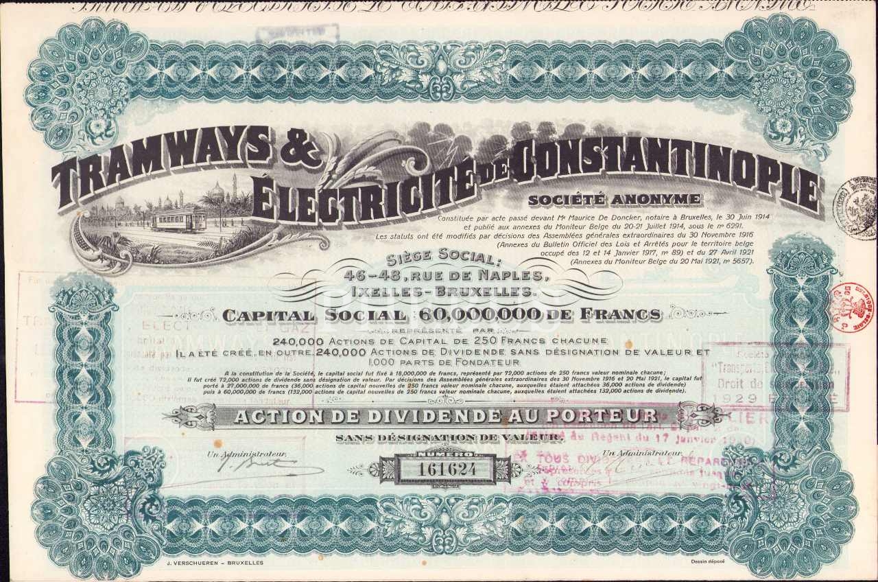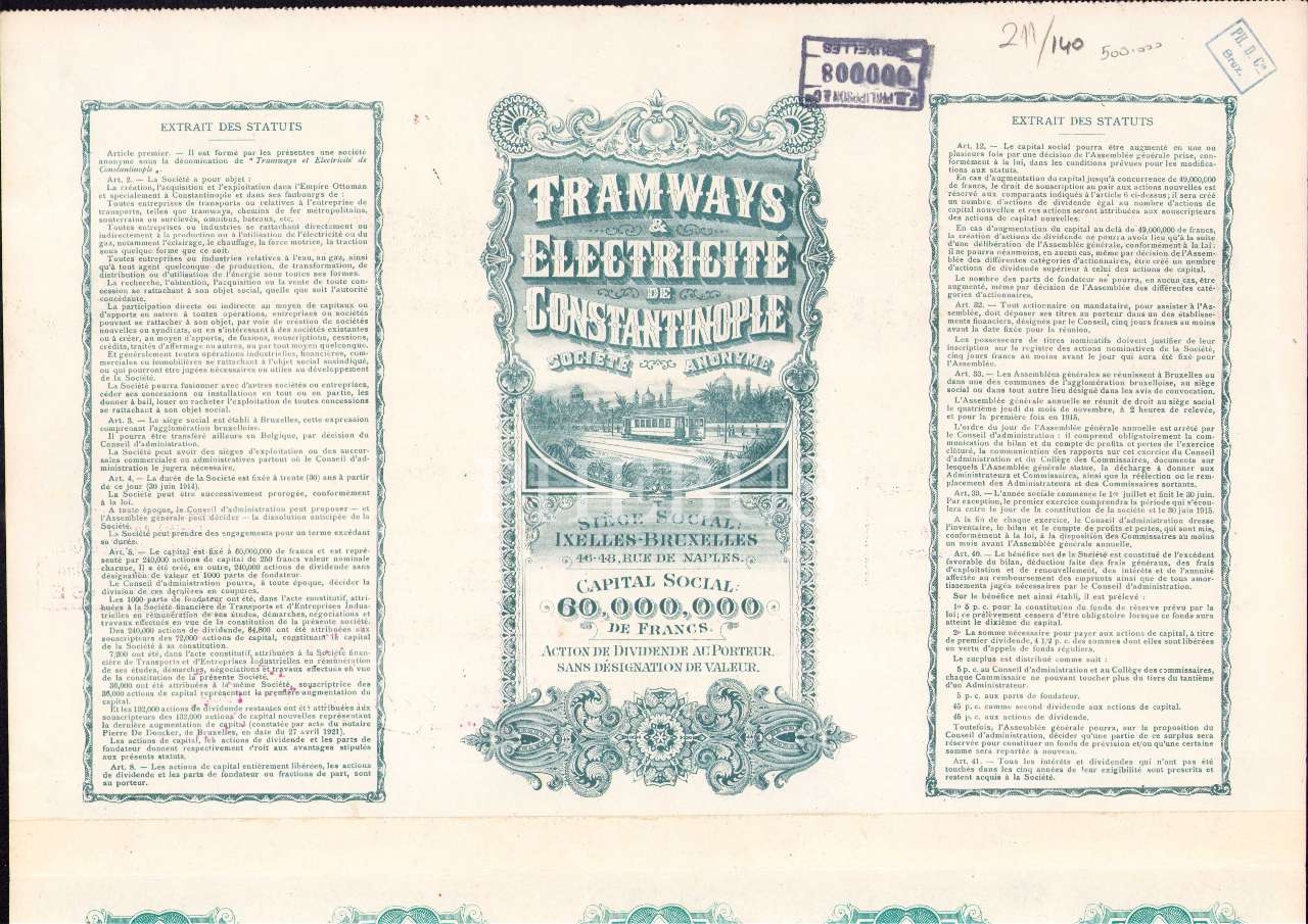 Tramways&Electricite de Constantinople Anonim Şirketi'ne ait Fransızca hisse senedi, 34x37 cm