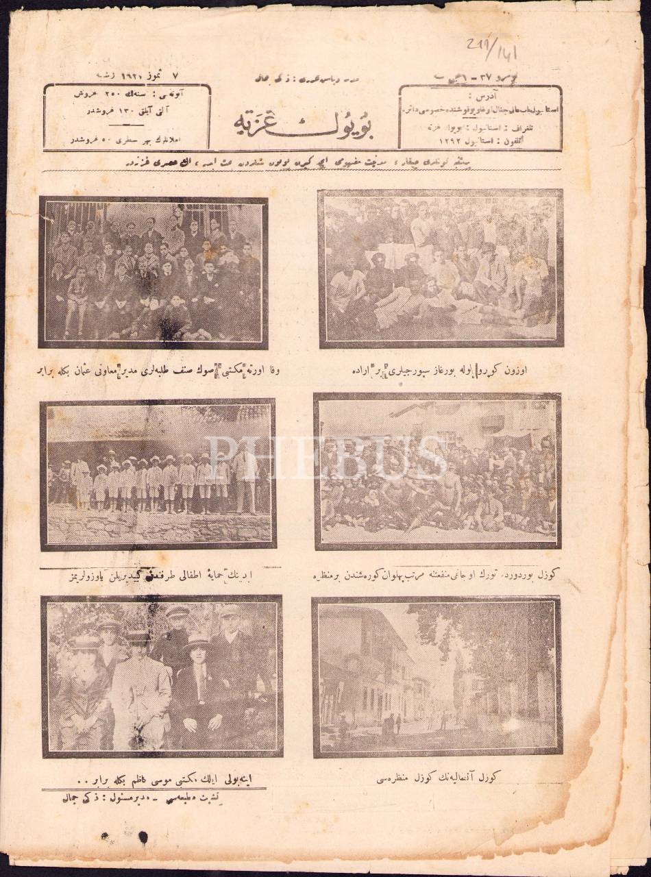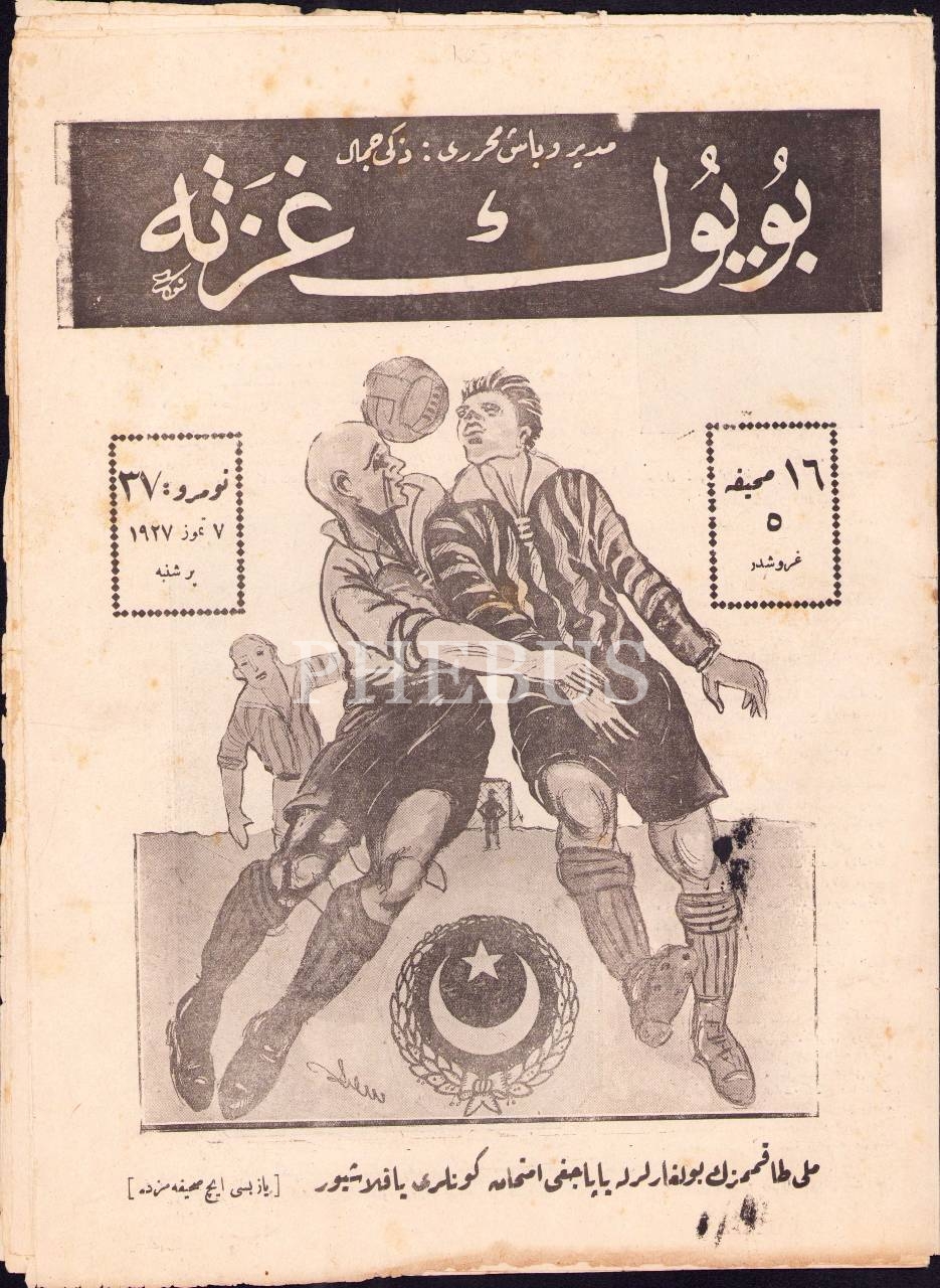Osmanlıca Büyük Gazete'nin 37. sayısı, 7 Temmuz 1927, "Milli Takımımızın Bulgarlarla Yapacağı İmtihan Günleri Yaklaşıyor" başlıklı ön kapak görseliyle, 24x34 cm, kapağı hafif yıpranmış haliyle