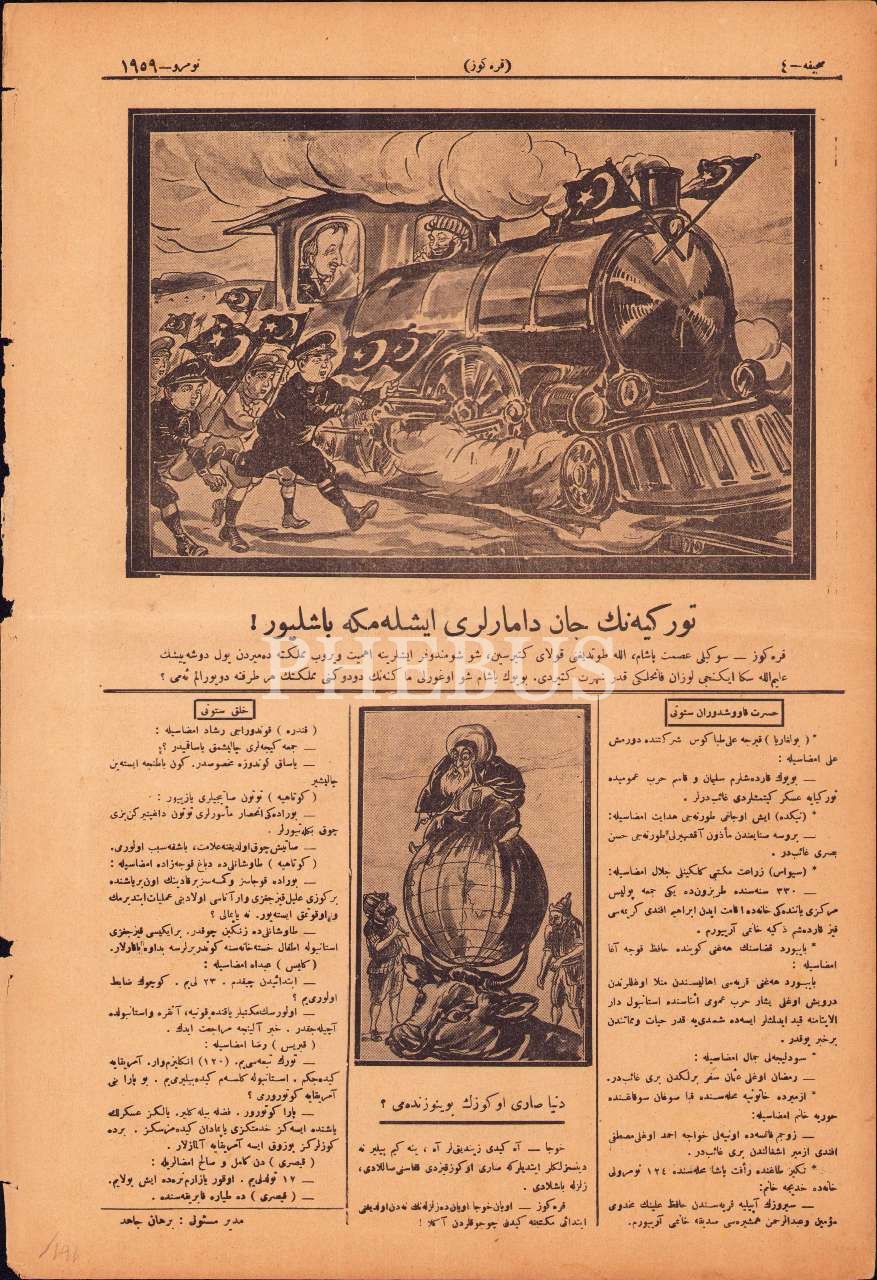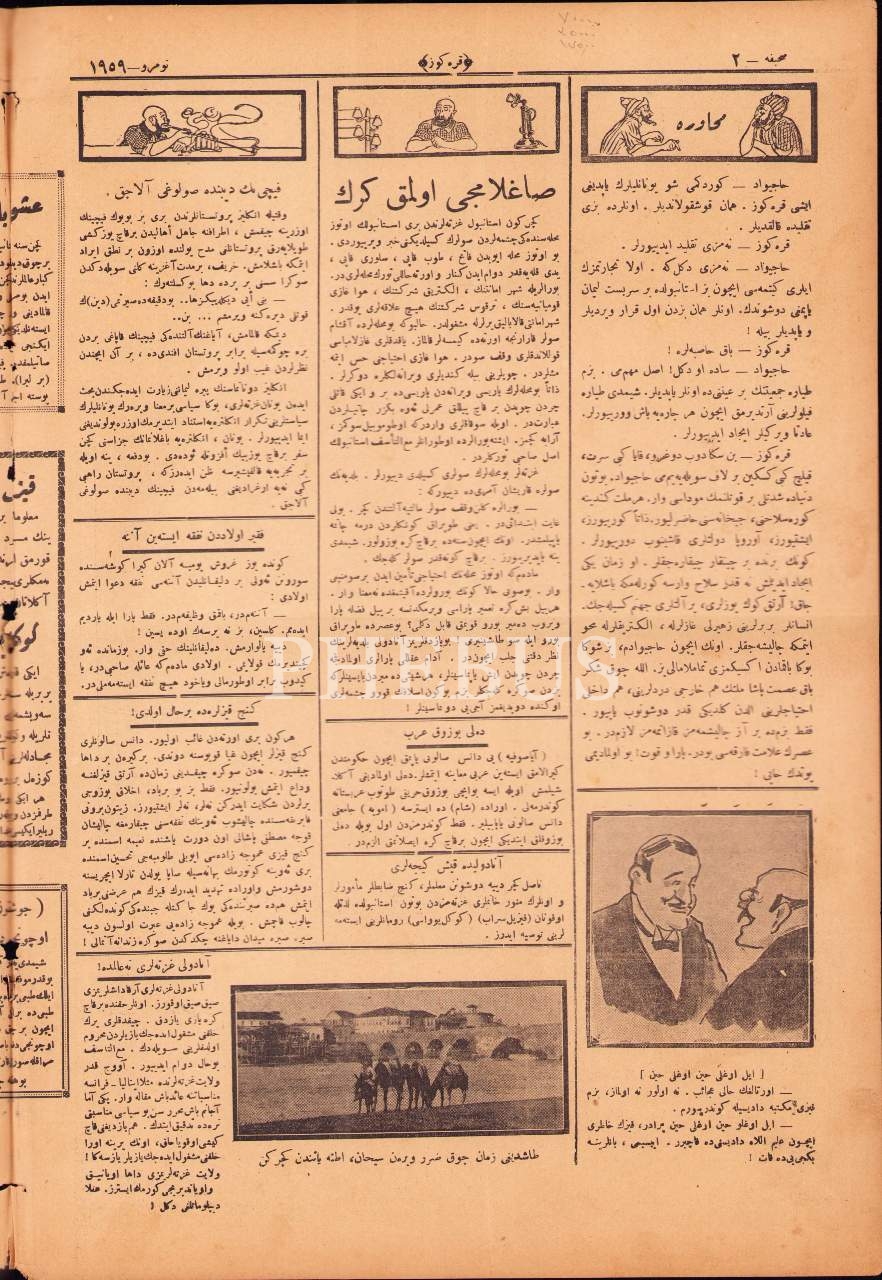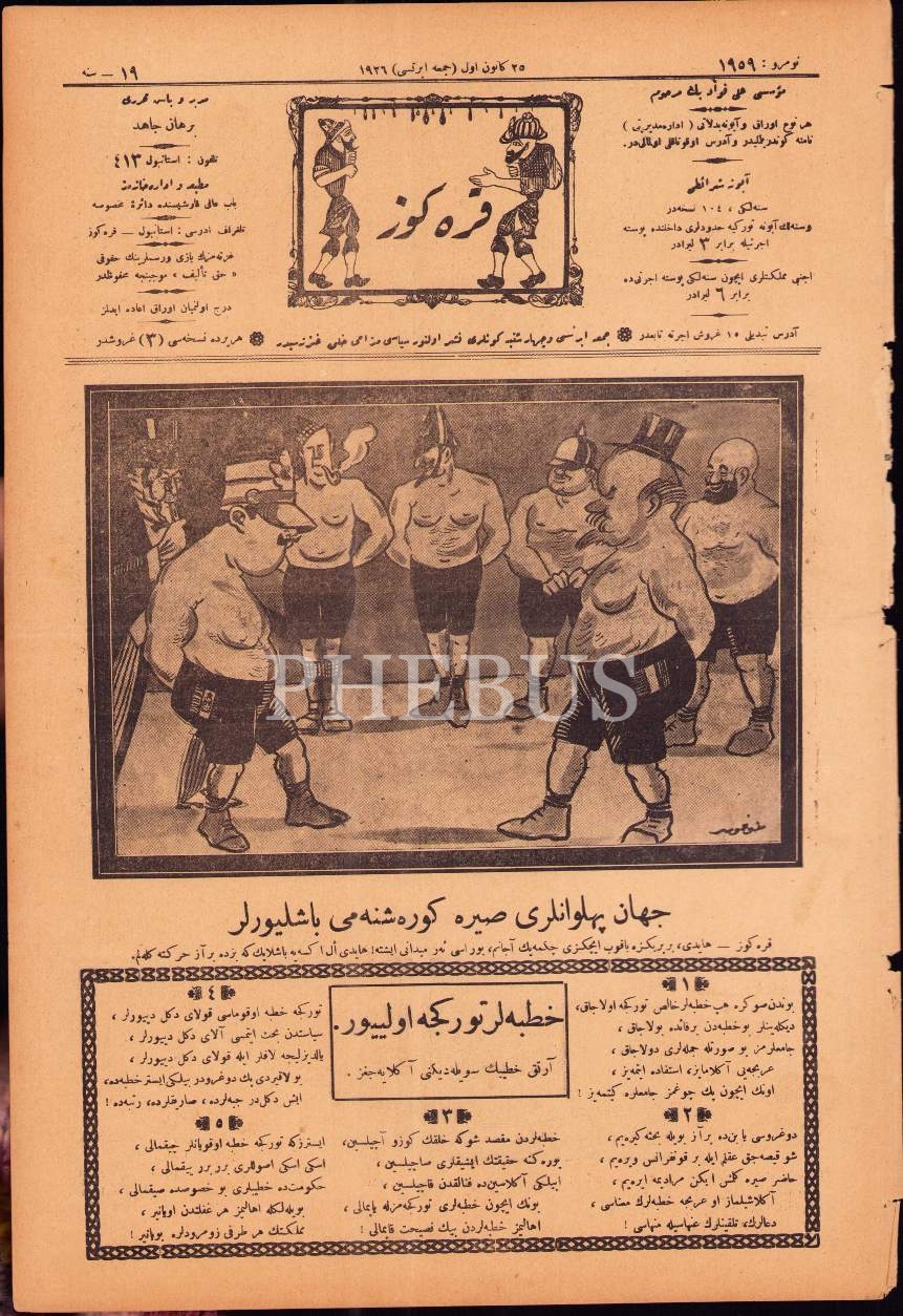 Osmanlıca Karagöz gazetesinin 1959. sayısı, 25 Kanunuevvel 1926, "Cihan Pehivanları Sıra Güreşine mi Başlıyorlar" başlıklı ön kapak görseliyle, 27x40 cm