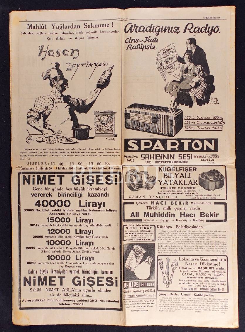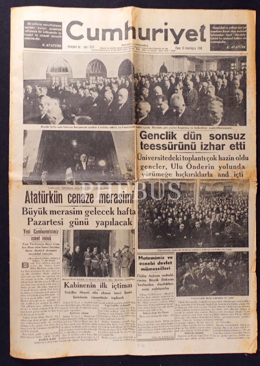 Cumhuriyet gazetesinin Atatürk'ün cenazesi konulu haberleriyle 5211. sayısı, 13 İkinciteşrin [Kasım] 1938, 44x63 cm, hafif yıpranmış haliyle