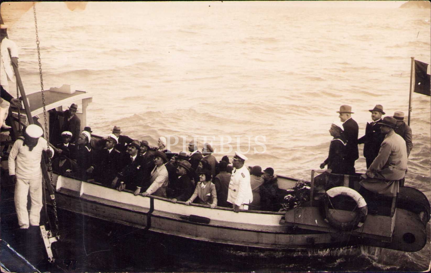 Kaptan ve mürettebat eşliğinde filikadan gemiye çıkan topluluk, alt köşesi kırık haliyle