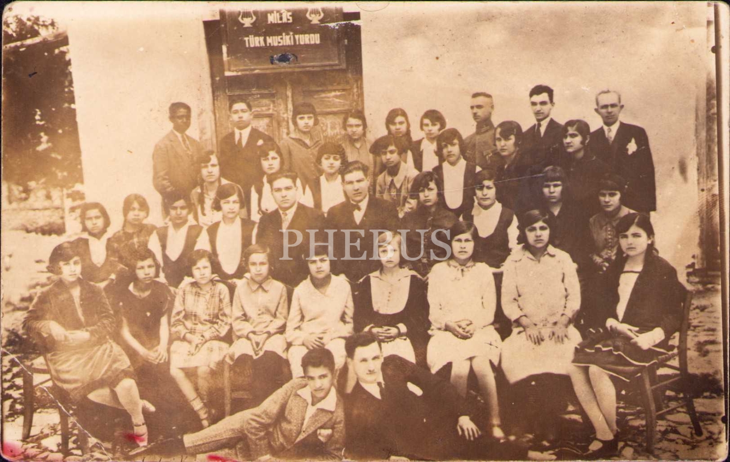 Milas Türk Musiki Yurdu tabelası önünde toplu hatıra fotoğrafı, alt köşesi kırık haliyle
