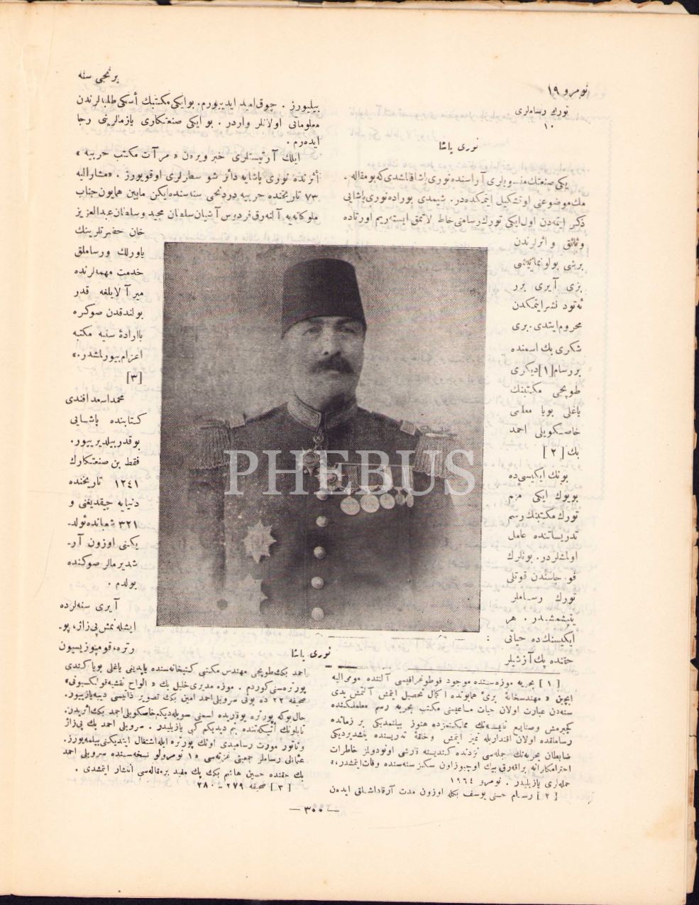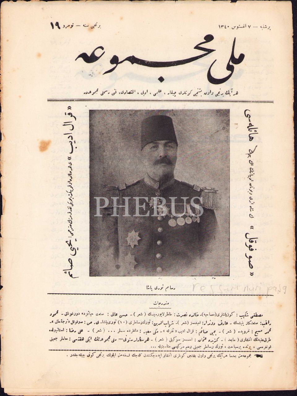 Osmanlıca Milli Mecmua'nın 19. sayısı, 7 Ağustos 1340, Ressam Nuri Paşa'ya ait ön kapak görseliyle, 24x31 cm, kapak sayfası hafif yıpranmış ve sayfaları açılmamış haliyle