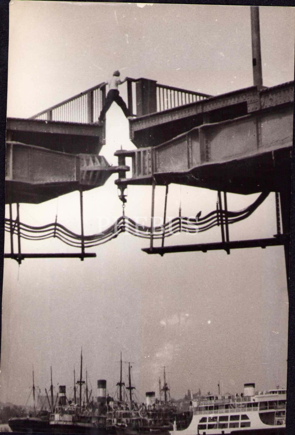 Galata Köprüsü'nün tam açılış anında çekilmiş "Cambaz değil, sadece işi acele" başlıklı basın fotoğrafı, Türk Haberler Ajansı/İstanbul, 12x18 cm