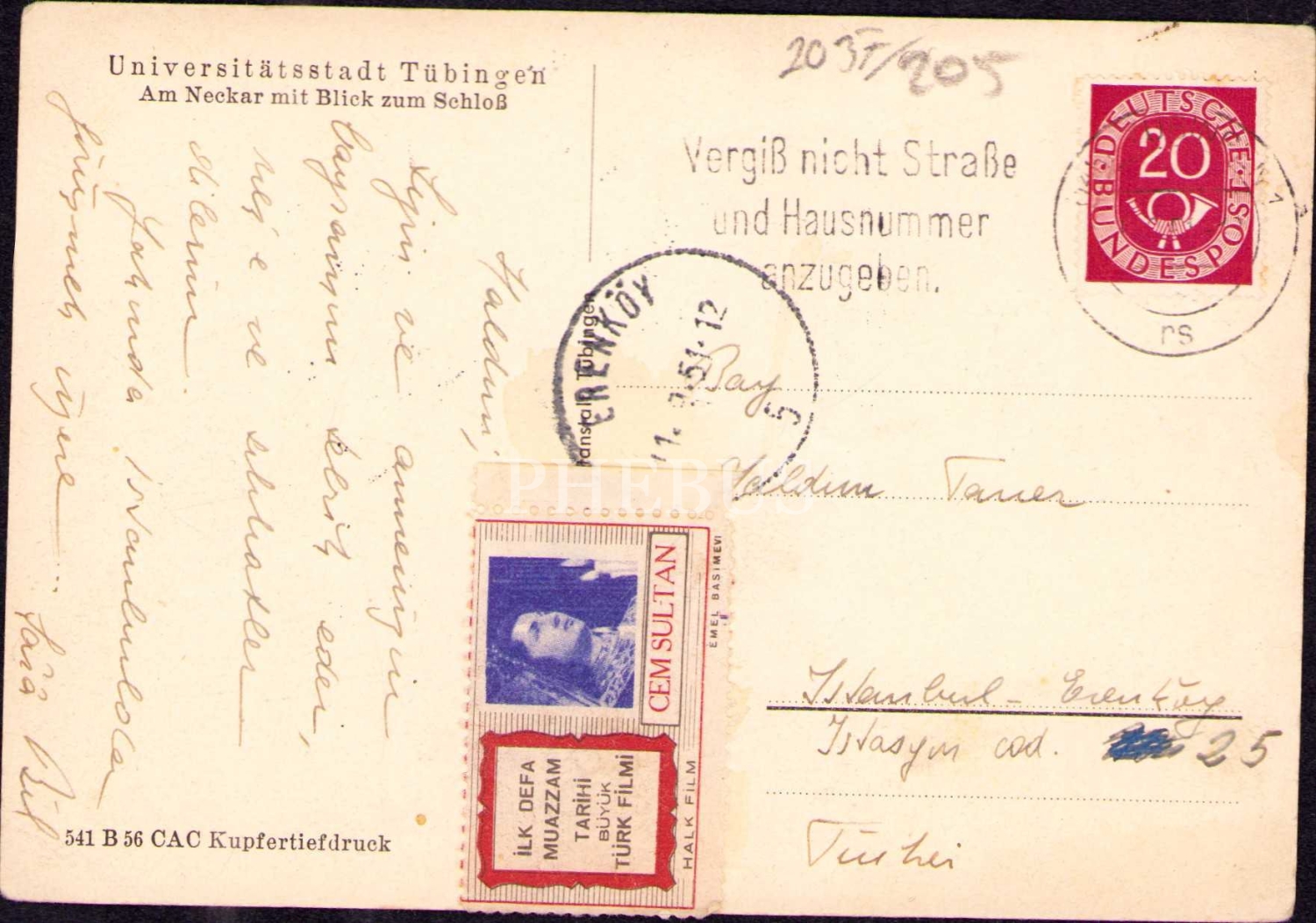 Kartın üzerinde, "İlk Defa Muazzam Tarihi Büyük Türk Filmi Cem Sultan" yazılı pul bulunmaktadır.