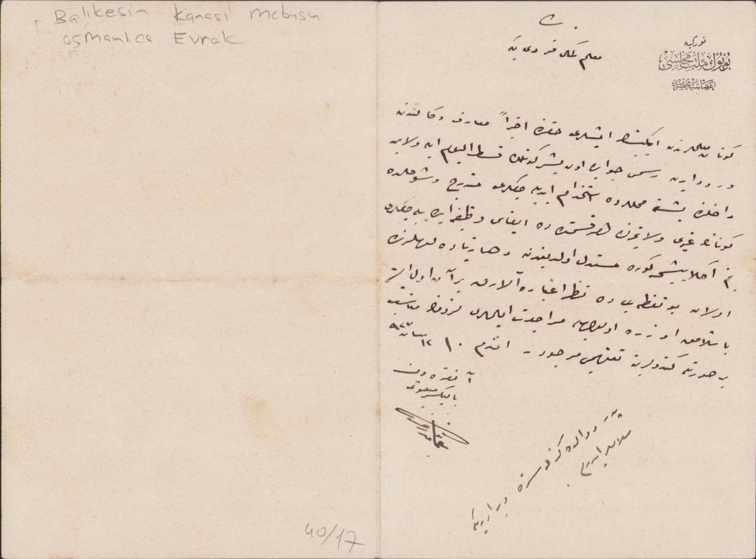 Osmanlı Türkiye Büyük Millet Meclisi azasına mahsus antetli, Balıkesir mebusu imzalı Osmanlıca evrak, 1927 tarihli, 13x20cm