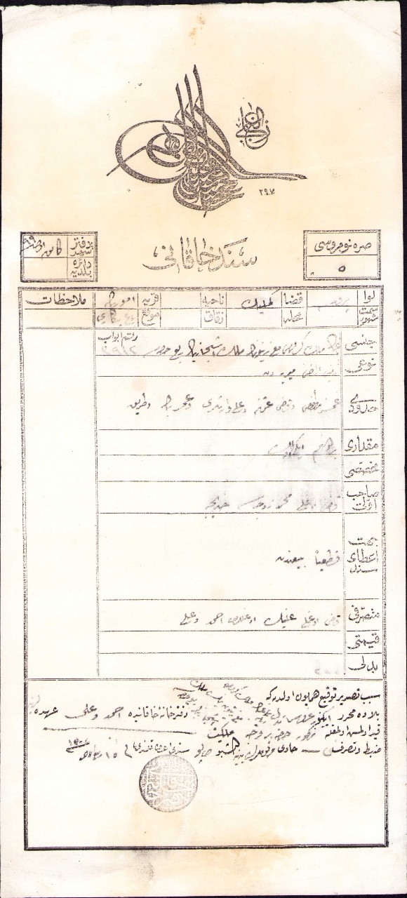 Osmanlıca Sened-i Hakanî antetli arz-ı miri tapusu, Gemlik/Bursa 1302?, 17x37 cm, mürekkebi yer yer karışmış haliyle