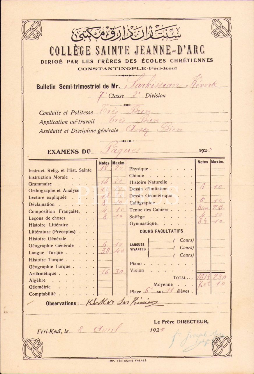 Osmanlıca-Fransızca Sainte Jeanne-D'Arc Mektebi-Feriköy/Constantinople antetli ve 1925 tarihli evrak, 17x25 cm, bir kenarı yırtık haliyle
