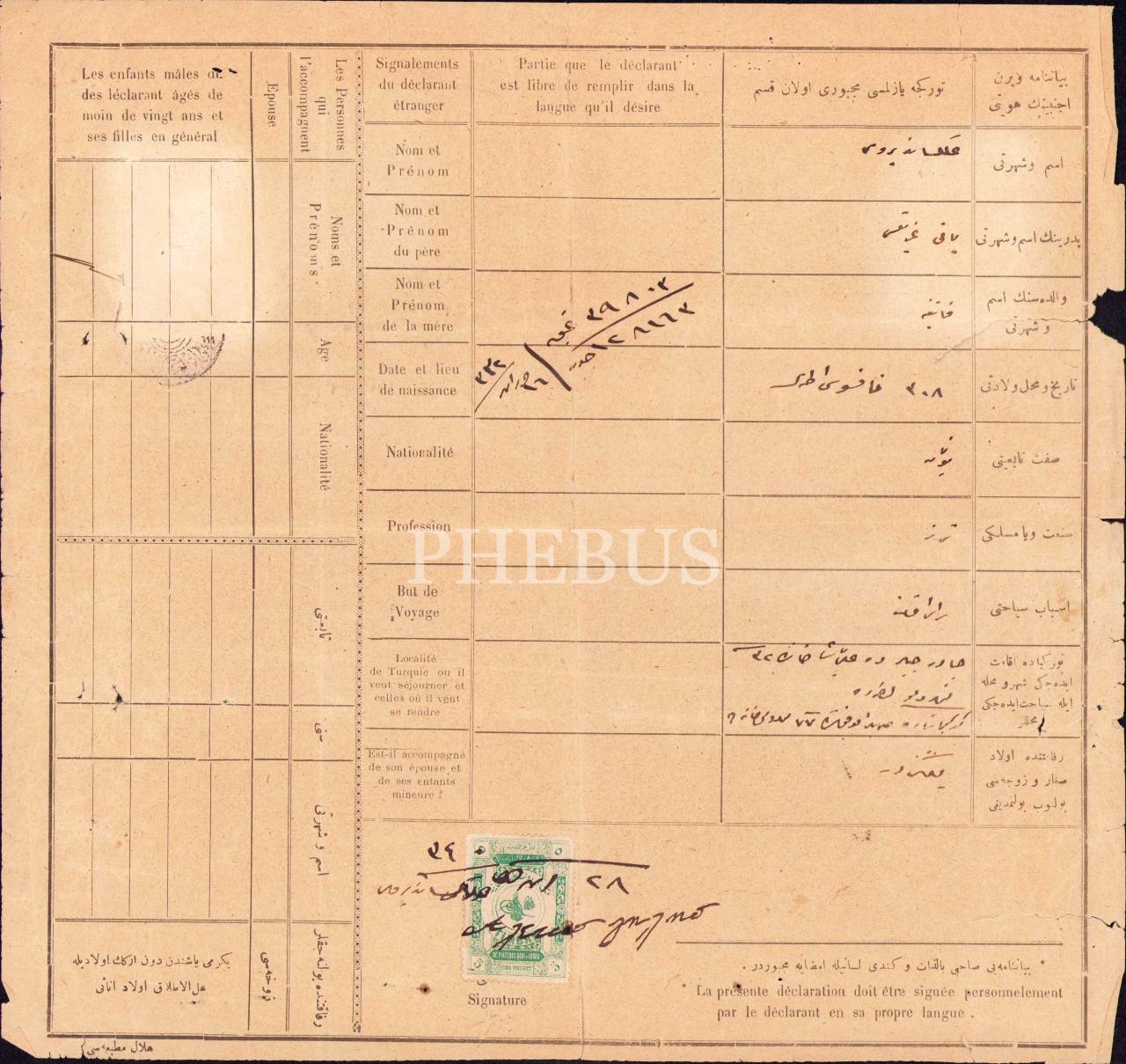 Türkiye'deki yabancılar için Osmanlıca-Fransızca yurtiçi seyahat beyannamesi/belgesi, 1340 tarihli, 27x29 cm, kenarları yırtılmış haliyle