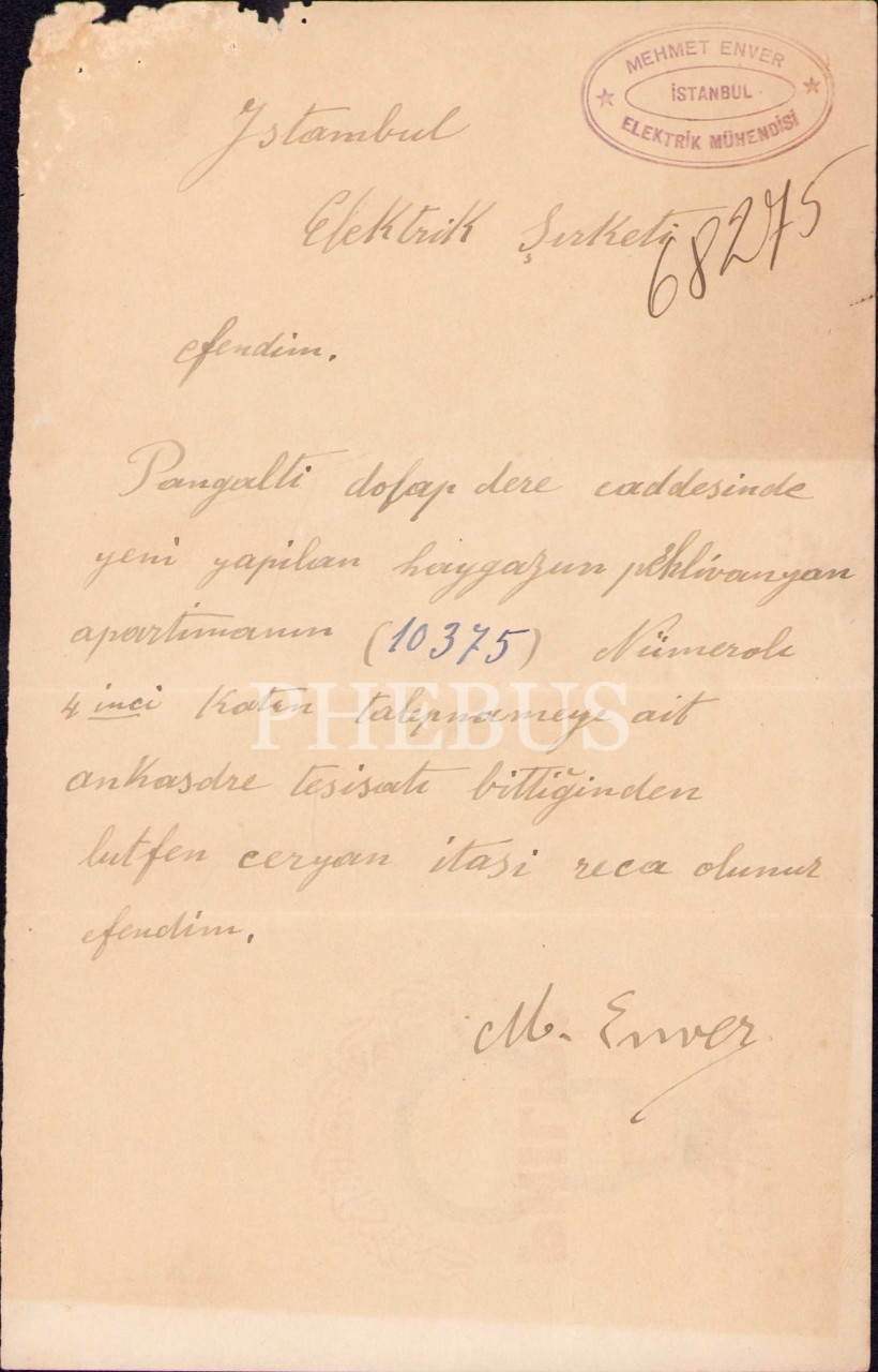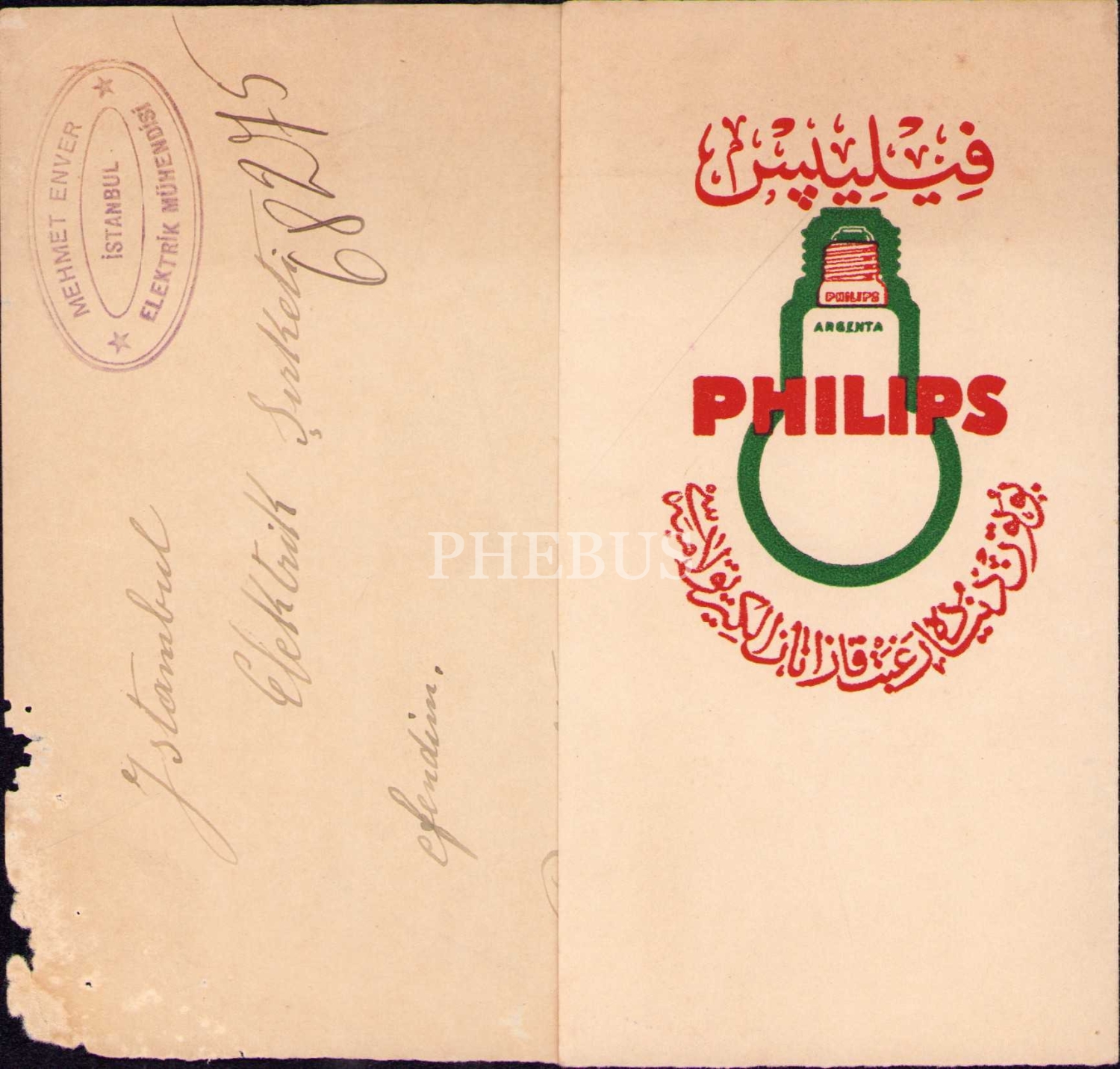 Osmanlıca Philips reklamlı ve Elektrik Mühendisi Mehmet Enver-İstanbul damgalı kâğıtta mektup, 14x22 cm, bir kenarı yenik haliyle