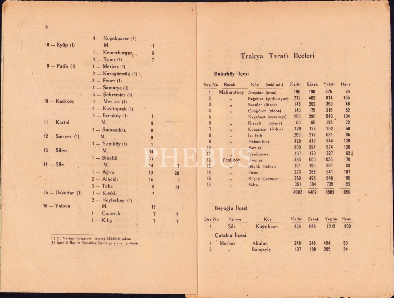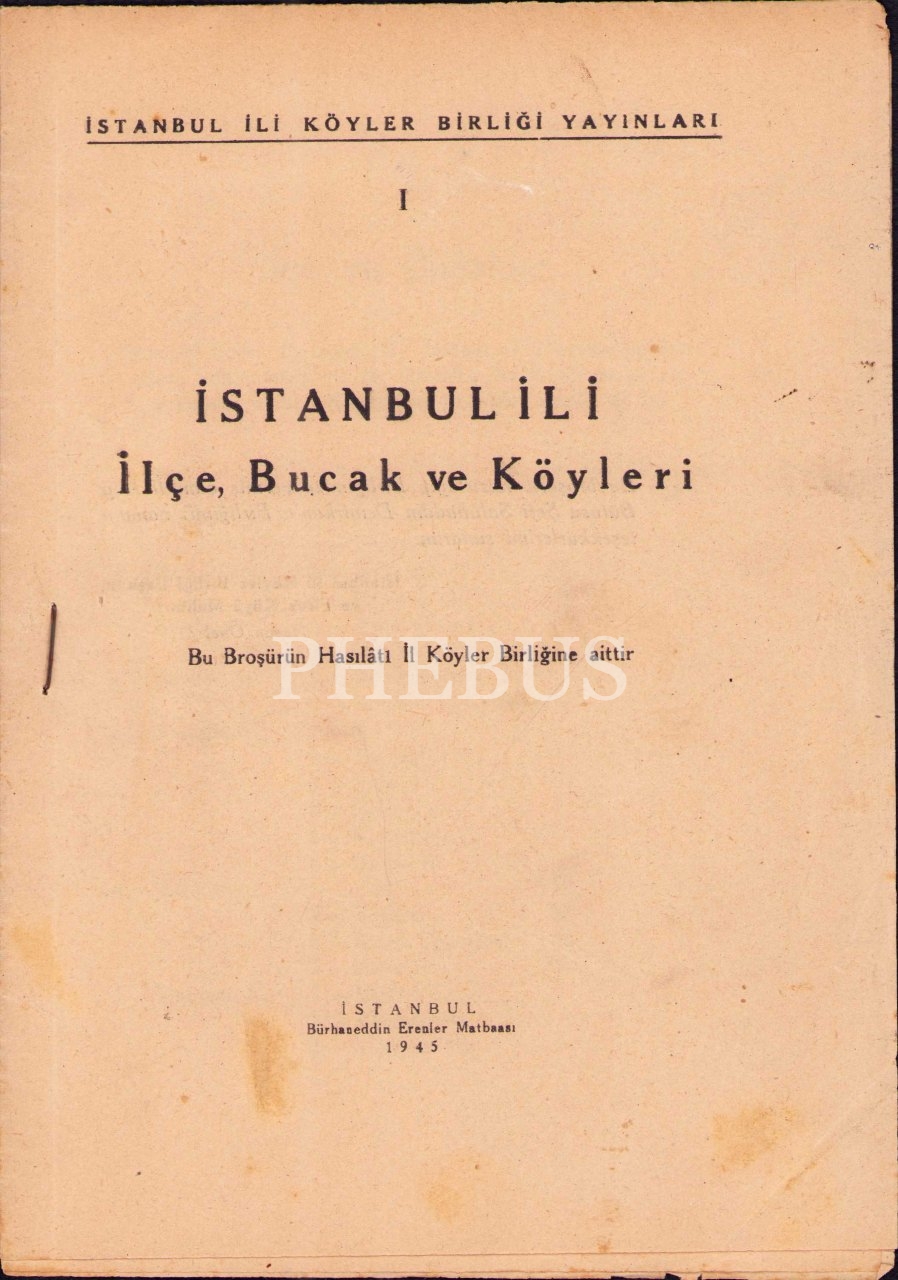 İstanbul İli Köyler Birliği Yayınları'ndan İstanbul İli İlçe, Bucak ve Köyleri [Harita ekiyle], İstanbul 1945, 14 s., 18x25 cm