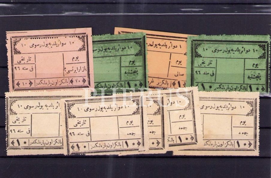 9 adet Osmanlıca belediye vergisi pulu, 5x7 cm