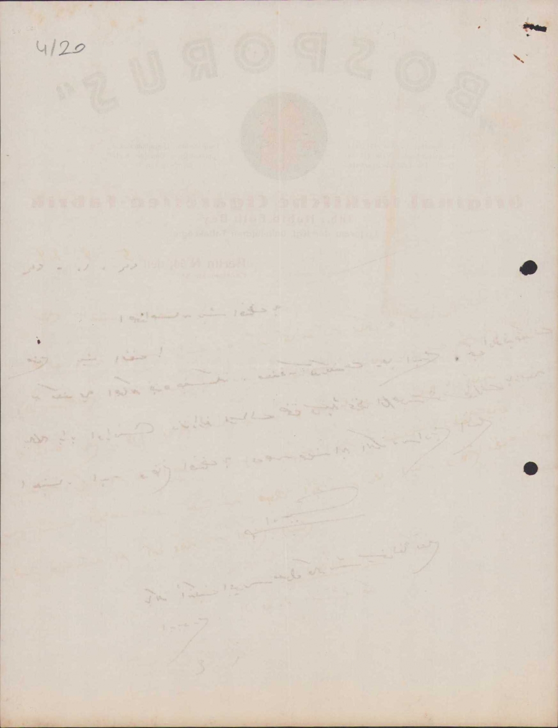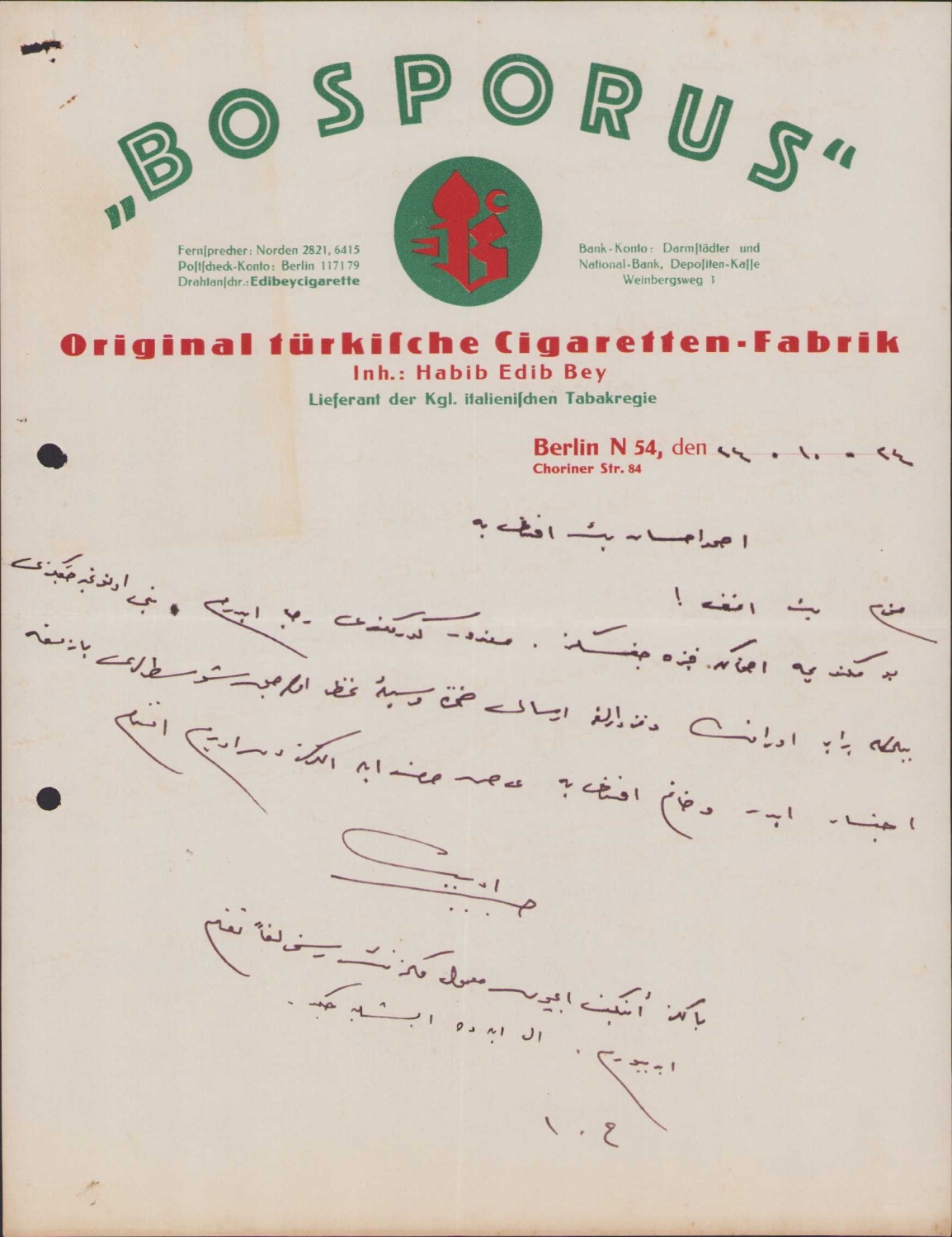 Alman Bosporus Türk Sigara Fabrikası antetli, Habib Edib Bey, Osmanlıca yazılı doküman, 22x29cm