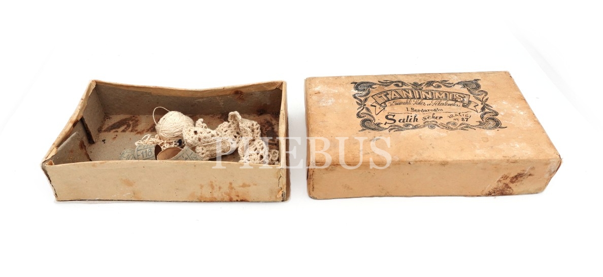 Kutu içinde tığ, iplik ve mezura bulunmaktadır.
