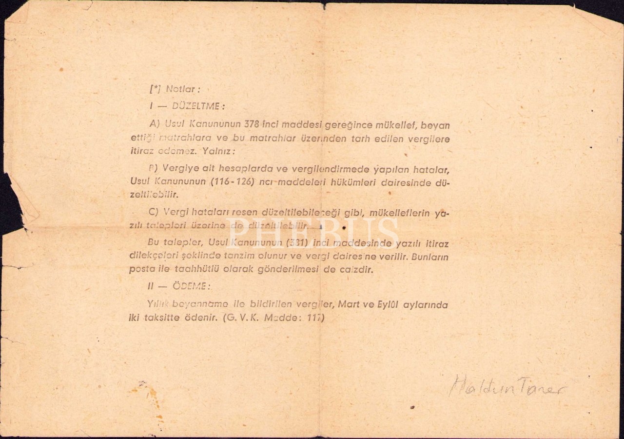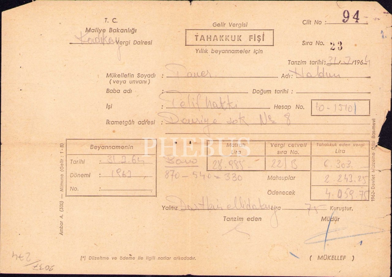 Haldun Taner adına telif hakkı tahakkuk fişi, Kadıköy/İstanbul 1964, 17x24 cm, kenarı yırtılmış haliyle