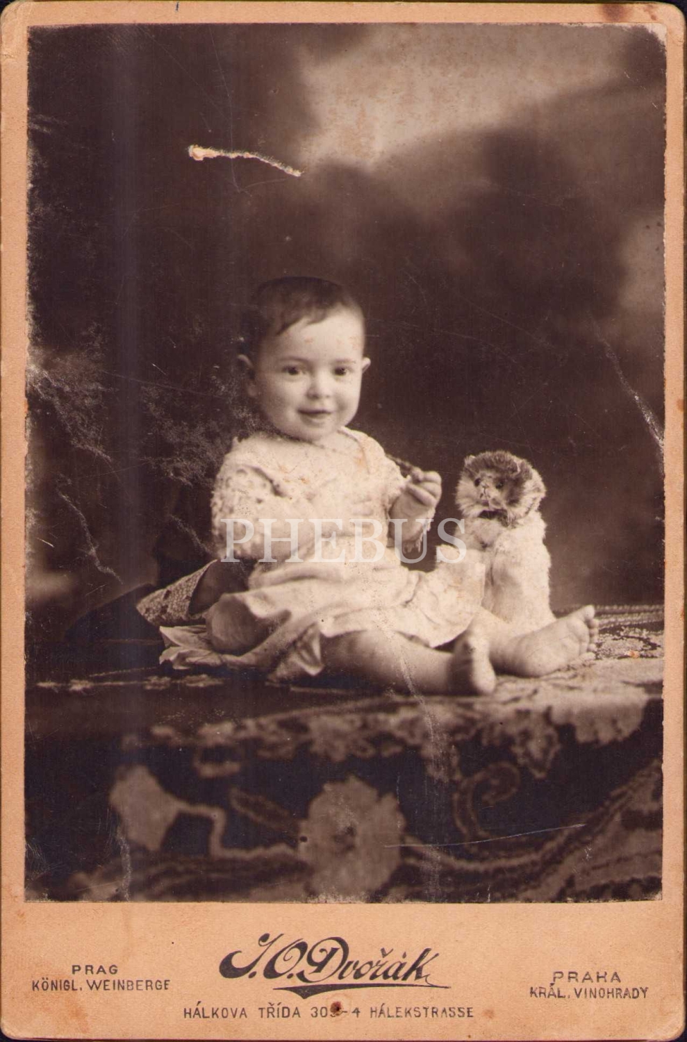 Oyuncağıyla poz veren bebek fotoğrafı, Osmanlıca-Fransızca-İbranice Hilal Fotoğrafhanesi damgalı, 11x16 cm, çizik haliyle