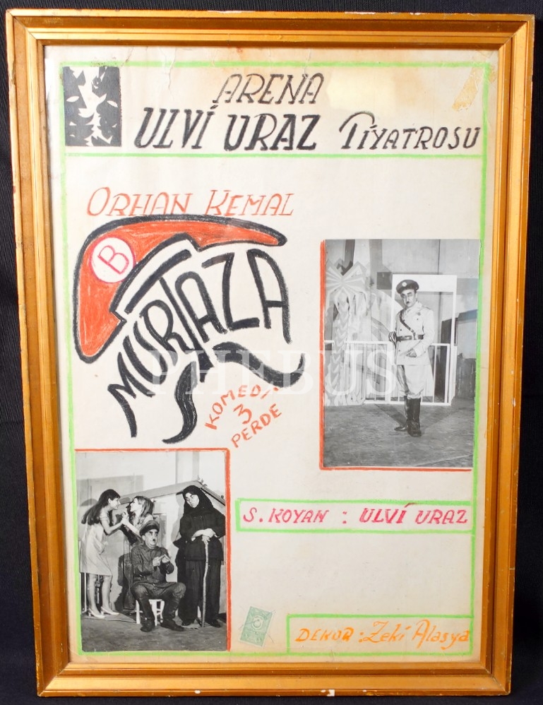ARENA'DA BULUNAN ULVİ URAZ TİYATROSU'NDAN ORHAN KEMAL'İN "MURTAZA" ADLI 3 PERDELİK KOMEDİ OYUNUNUN EL ÇİZİMİ, DAMGA PULLU VE İKİ ADET ORİJİNAL FOTOĞRAFLI AFİŞİ, 53X39 CM