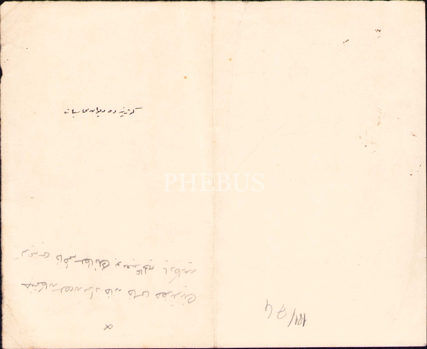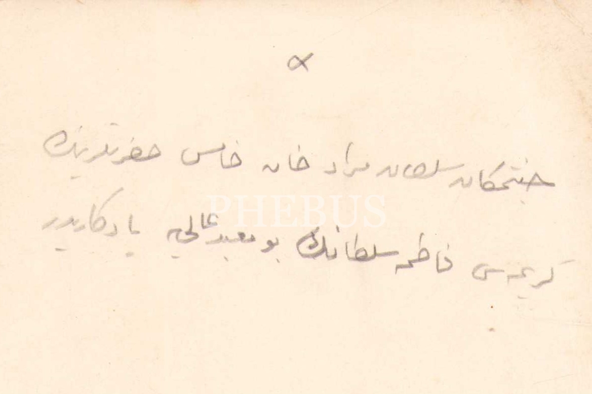 İsmail Hakkı Altunbezer terekesinden rik'a yazı: "Cennetmekân Sultan Murad Hân-ı Hâmis hazretlerinin kerîmesi Fâtıma Sultan'ın bu ma'bed-i âliye yadigârıdır", 17x21 cm