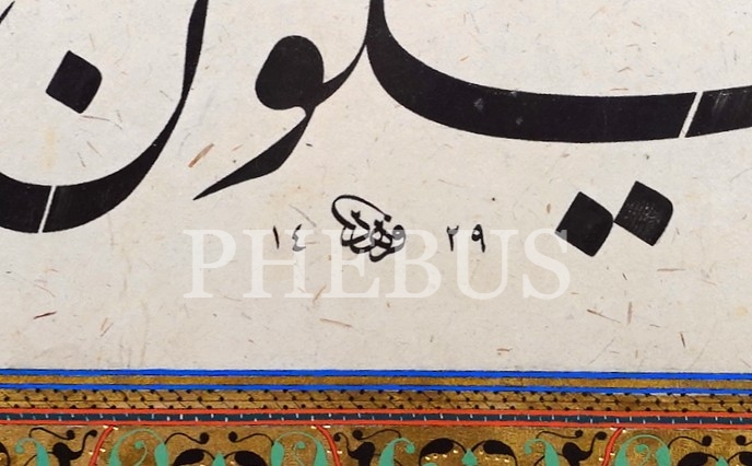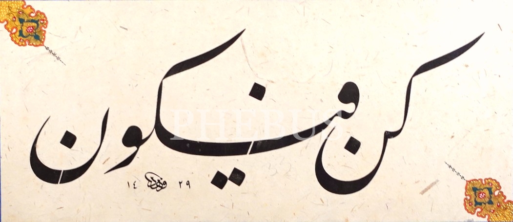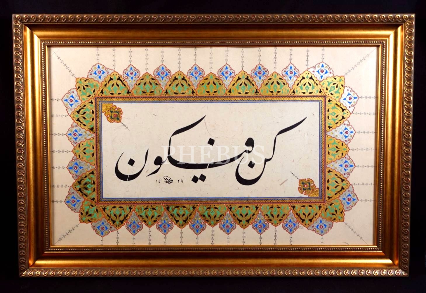 Ta'lik ayet: "Kün fe-yekûn ['Ol!' der ve olur]" (Bakara/117), Ferhad [Kurlu] ketebeli ve 1429 tarihli, tezhipli ve çerçeveli, yazı: 20x46 cm
