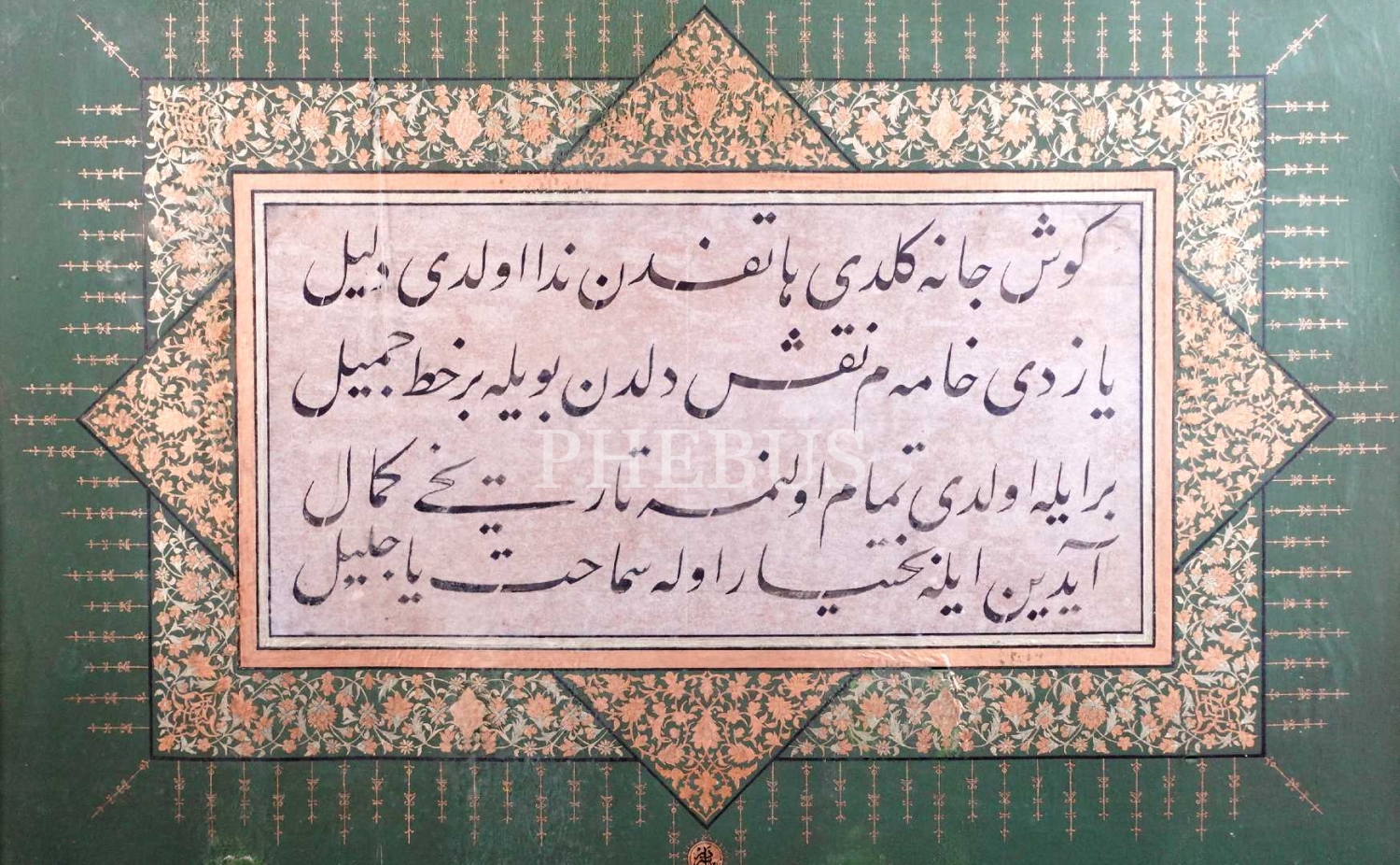 Hoca işi ta'lik kıta: "...Yazdı hâmem nakş-ı dilden böyle bir hatt-ı cemîl…", Tezhip: İdris ketebeli ve 1431 tarihli tezhipli ve çerçeveli, yazı: 20x40 cm
