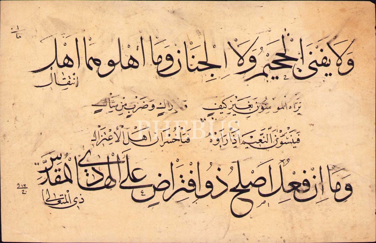 Hoca işi sülüs-nesih kıta: Maturidi akaidine dair manzum risale Bed'ü'l-Emâli'den "Ve lâ yefna'l-cahîm ve lâ el-cinân ve lâ ehlûhâ ehlü intikâl…", 14x22 cm