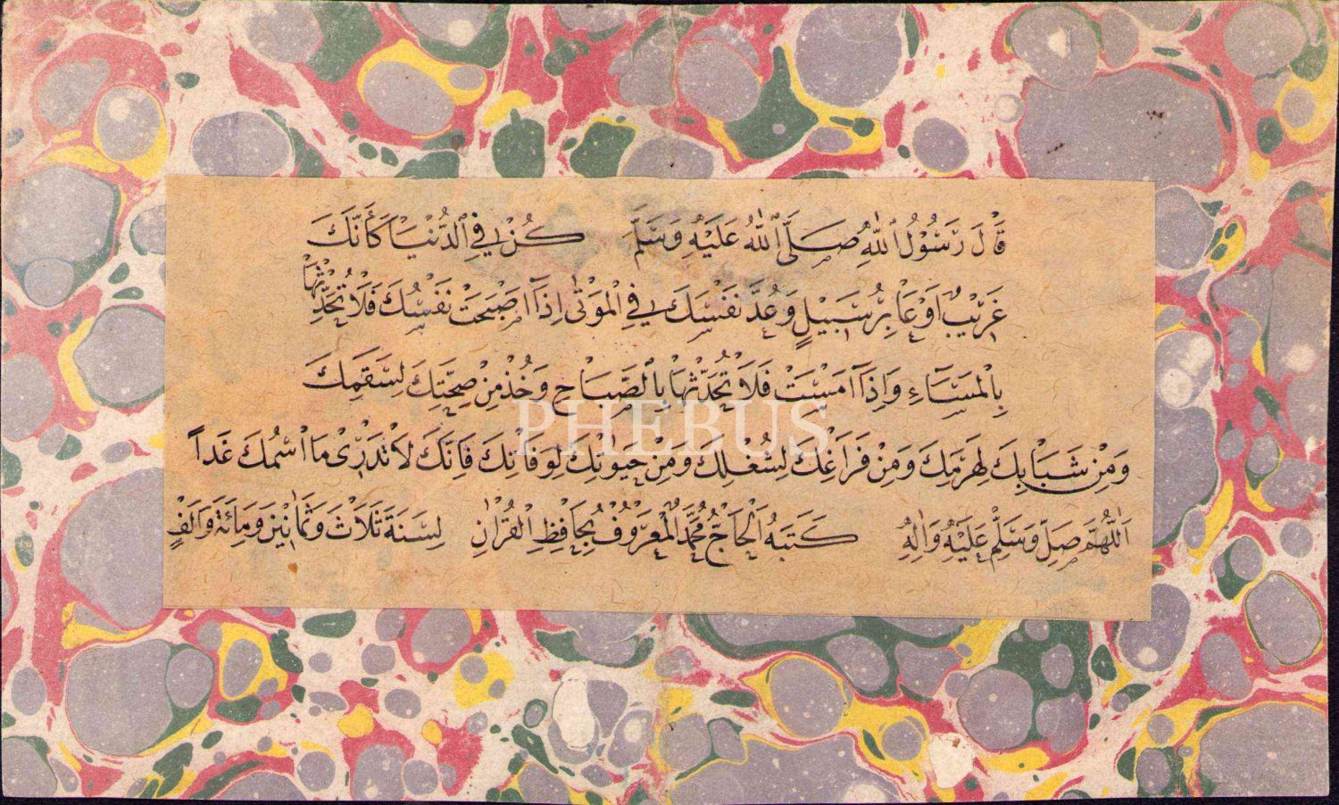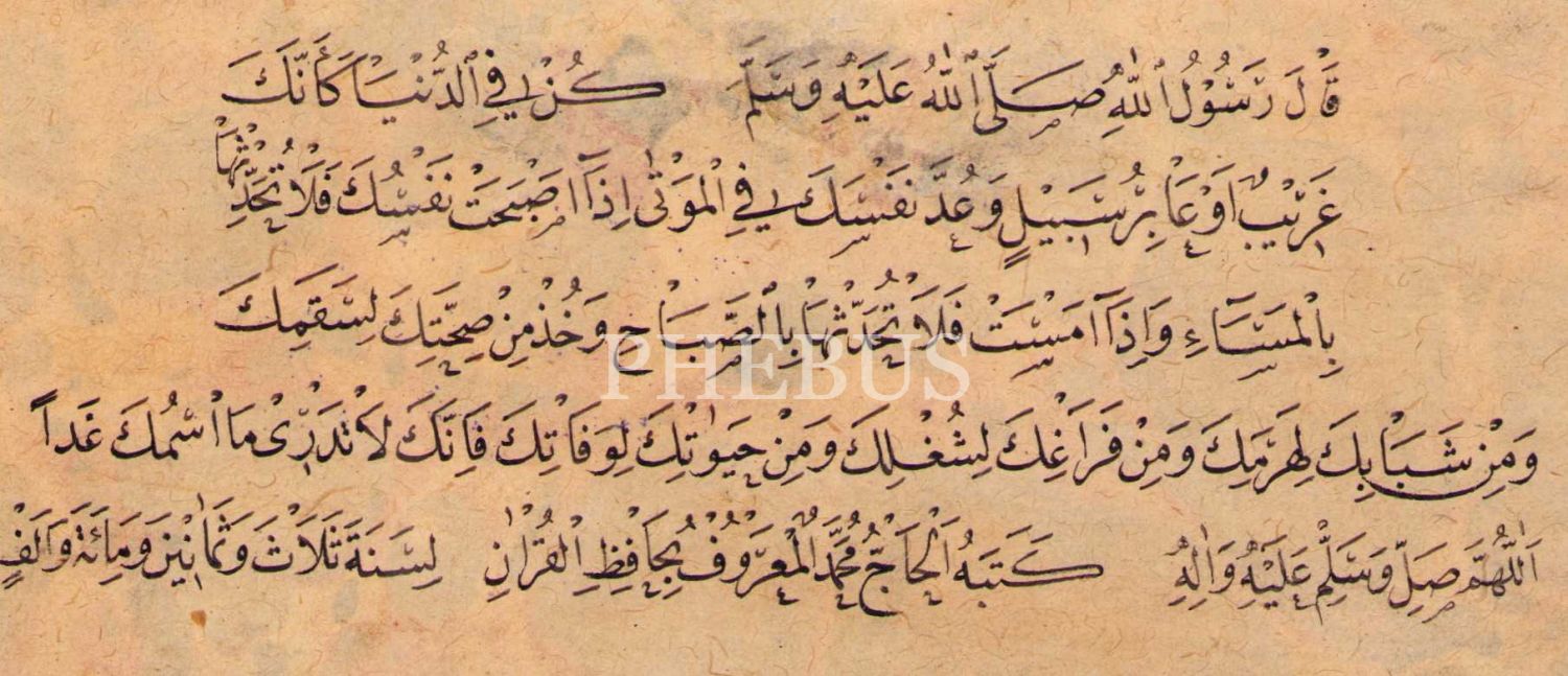 Nesih hatla hadis: "Kün fi'd-dünyâ ke-enneke garîbun ev âbiru sebîlin … [Dünyada bir garip veya bir yolcu gibi ol]", Hafız-ı Kur'ân el-Hac Muhammed ketebeli ve 1183 tarihli, ebru pervazlı, yazı: 7x16 cm