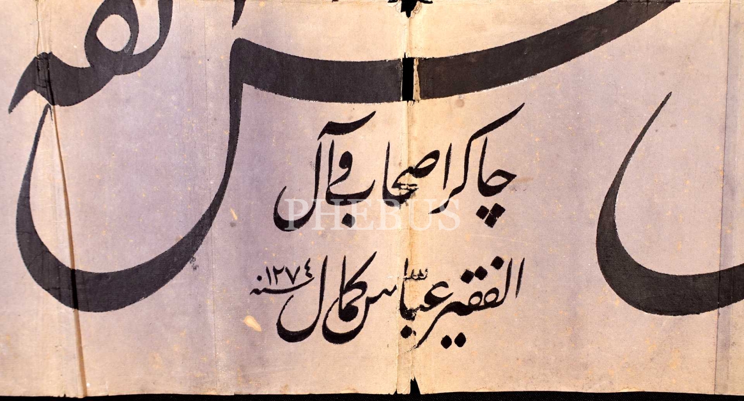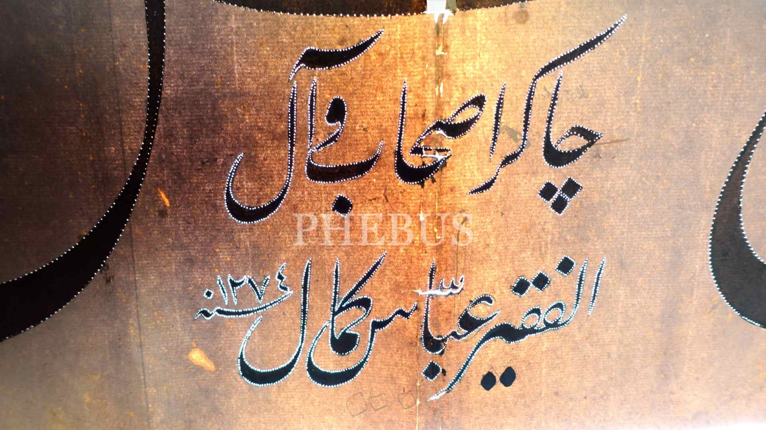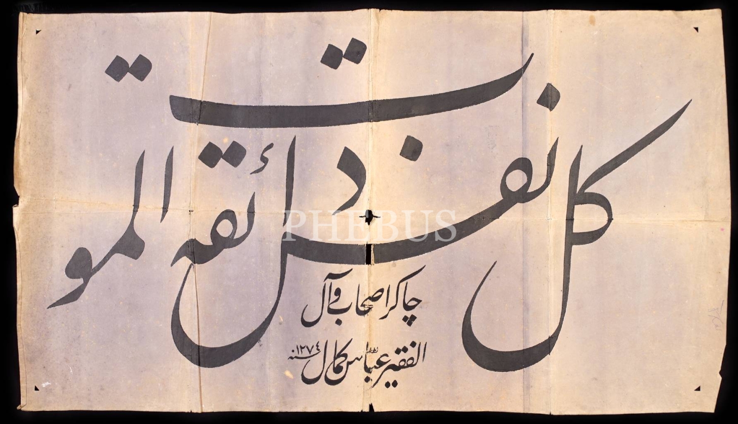 İğneli kalıpla celî ta'lik ayet: "Küllü nefsin zâikatü'l-mevt [Her nefs ölümü tadacaktır]" (Âl-i İmrân/185), Abbas Kemal ketebeli ve 1274 tarihli, 44x76 cm