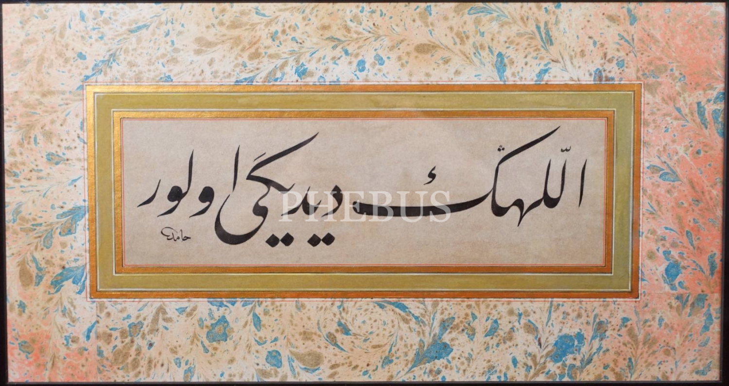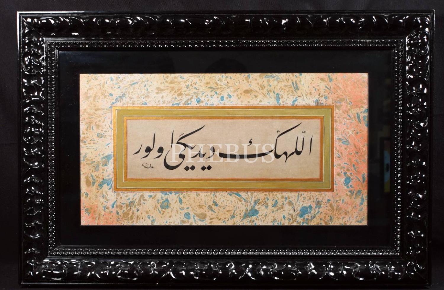 Hâmid Aytaç ketebeli ta'lik yazı: "Allah'ın dediği olur", ebrulu ve çerçeveli, yazı: 10x31 cm
