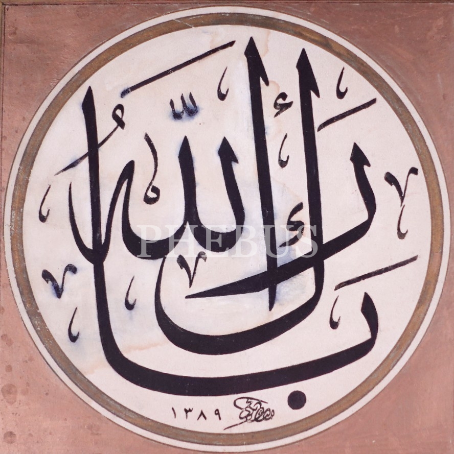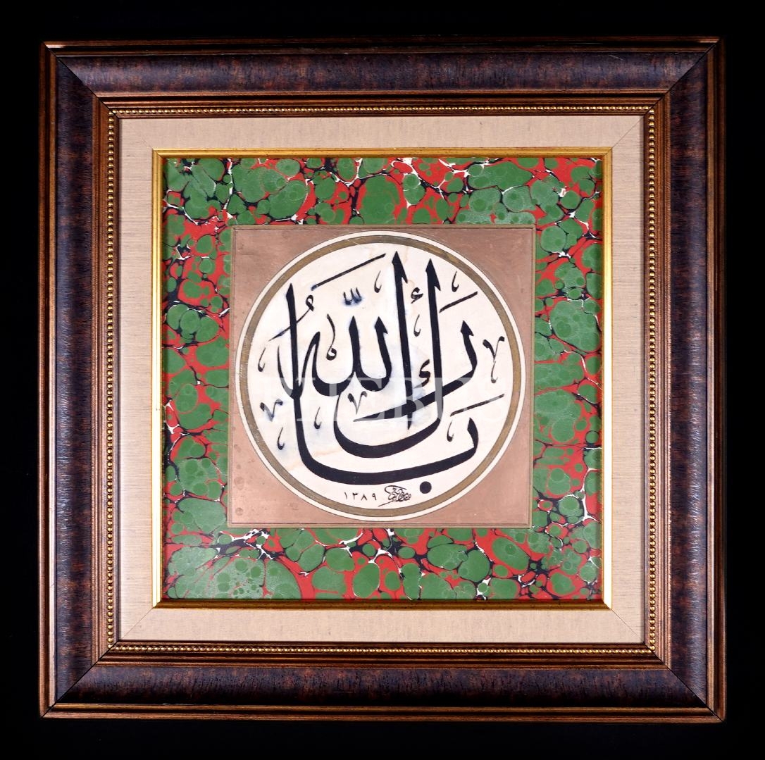 Celî sülüs istif yazı: "Bârekallah [Allah mübarek kılsın]", Mustafa Bekir Pekten ketebeli ve 1389 tarihli, ebrulu ve çerçeveli, yazı: 18x18 cm